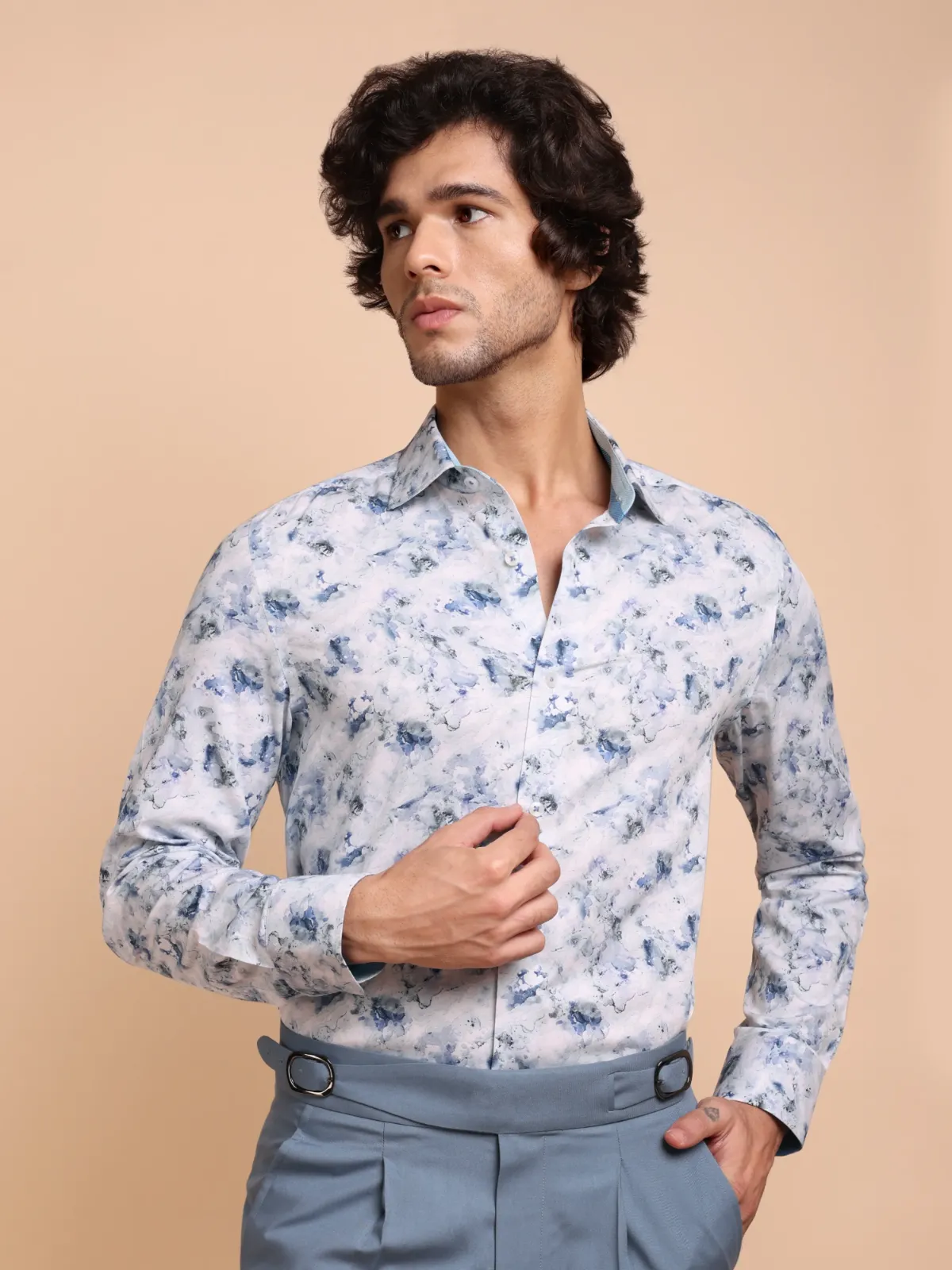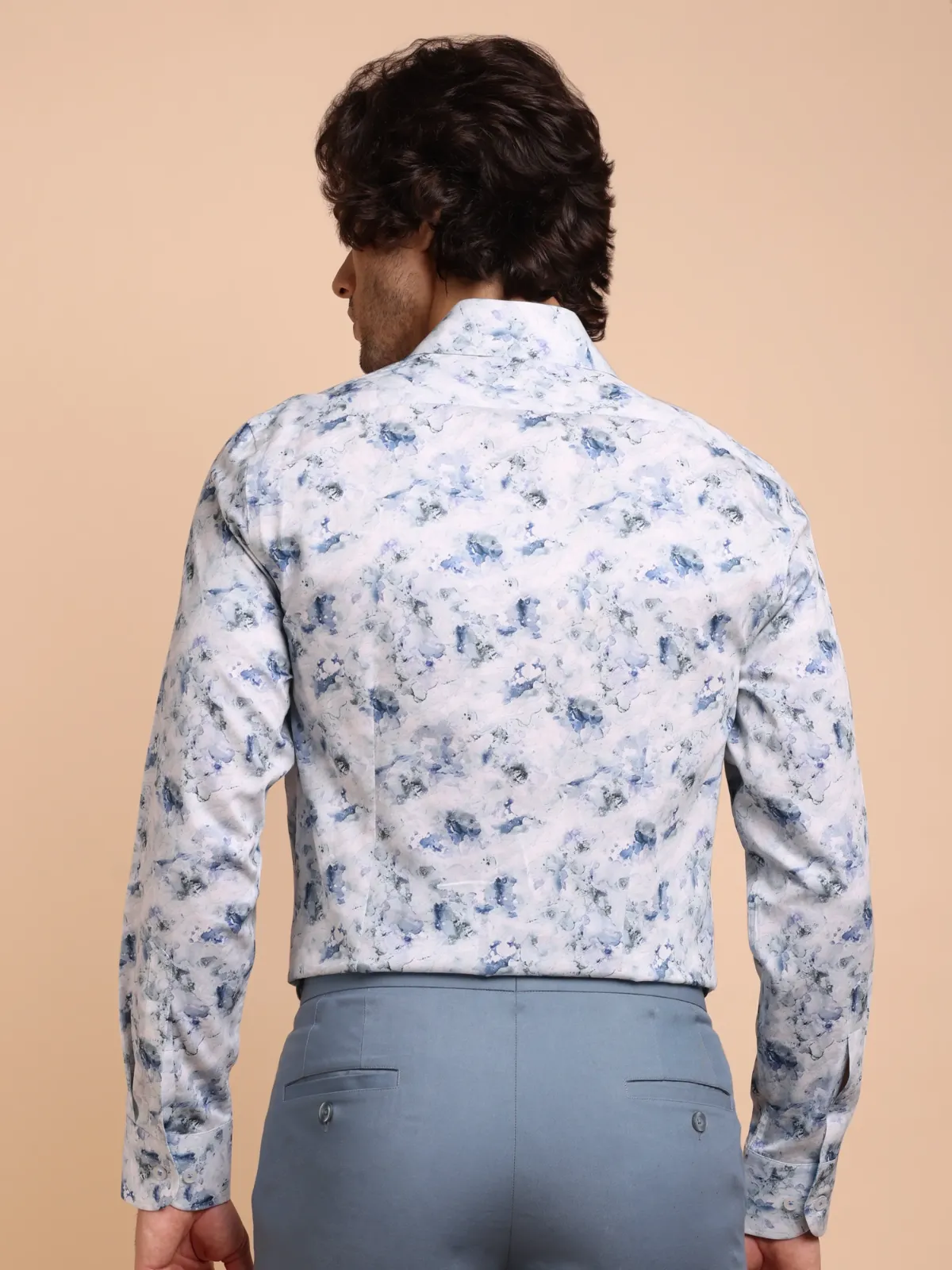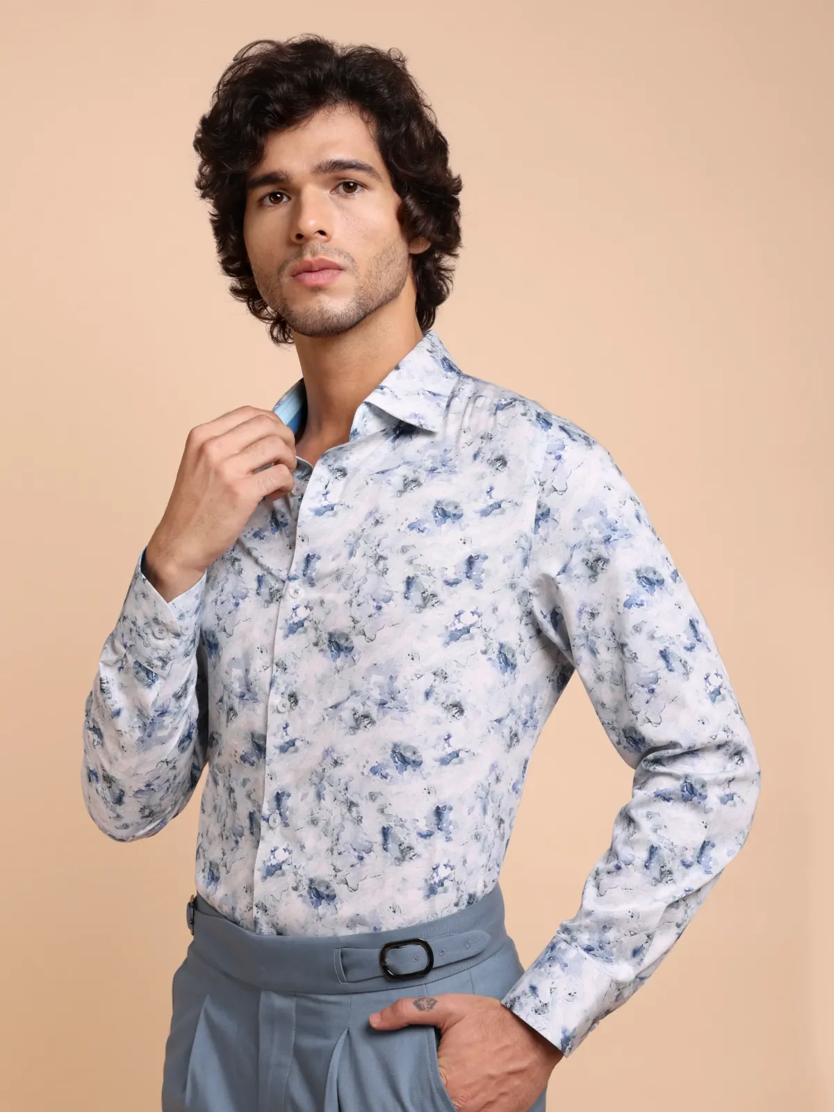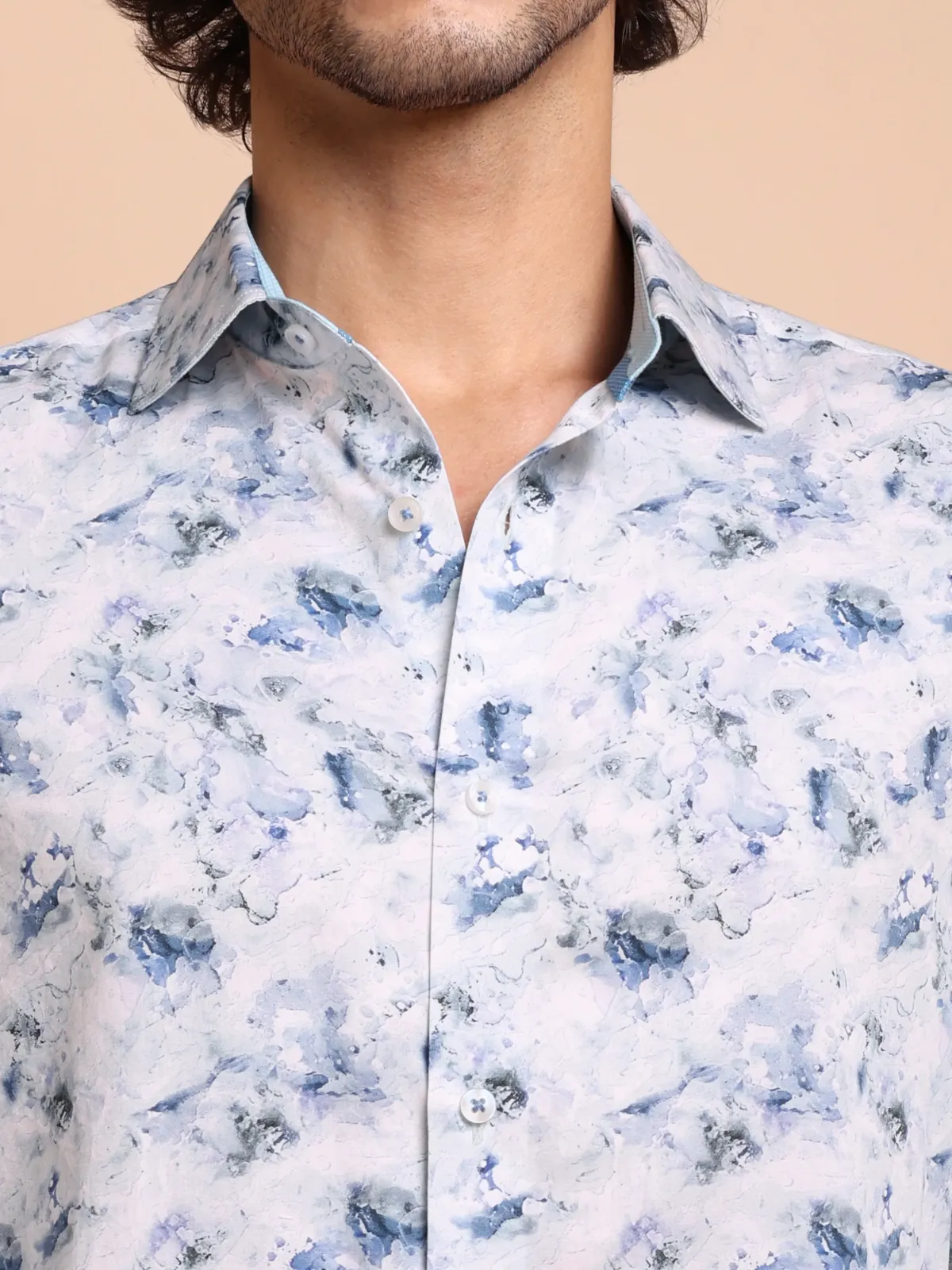 Spice up your wardrobe with this semi-casual shirt crafted from premium cotton featuring an awe inspiring abstract marble like print in muted blue and aqua green tones on white base. The inner, two tone band and cuffs add to the unique statement of the overall design.