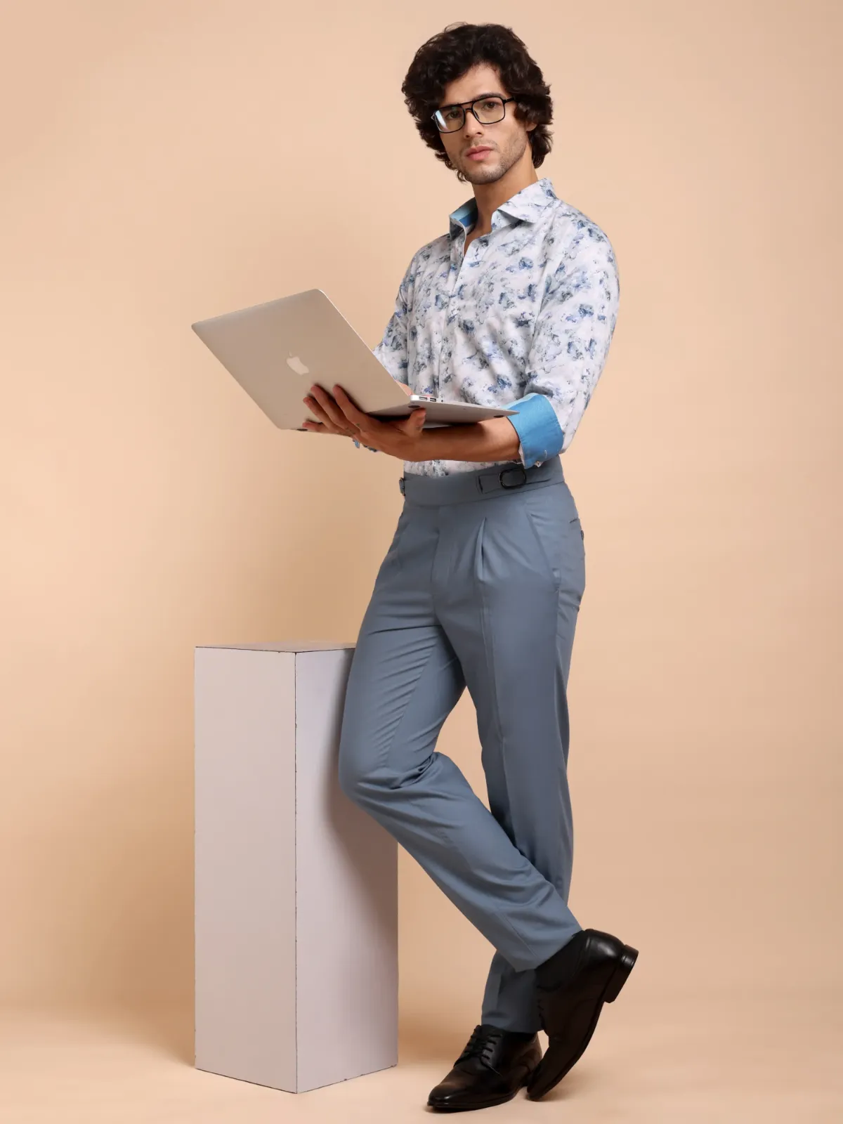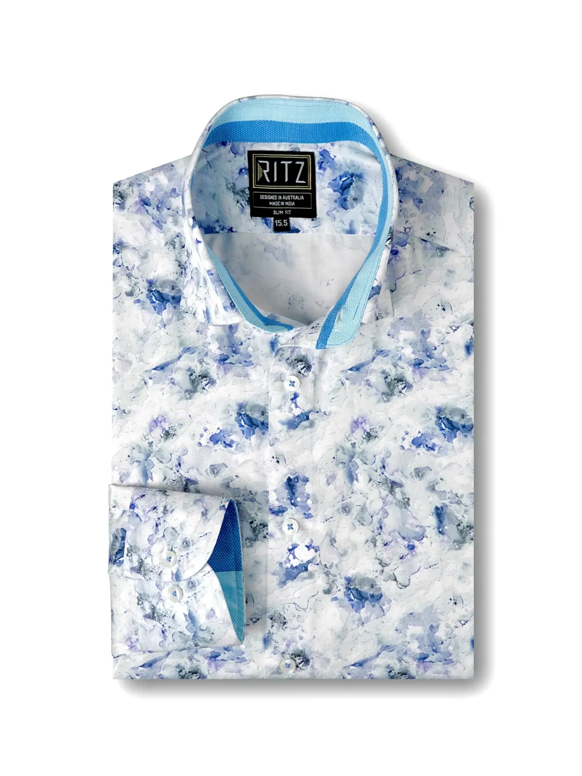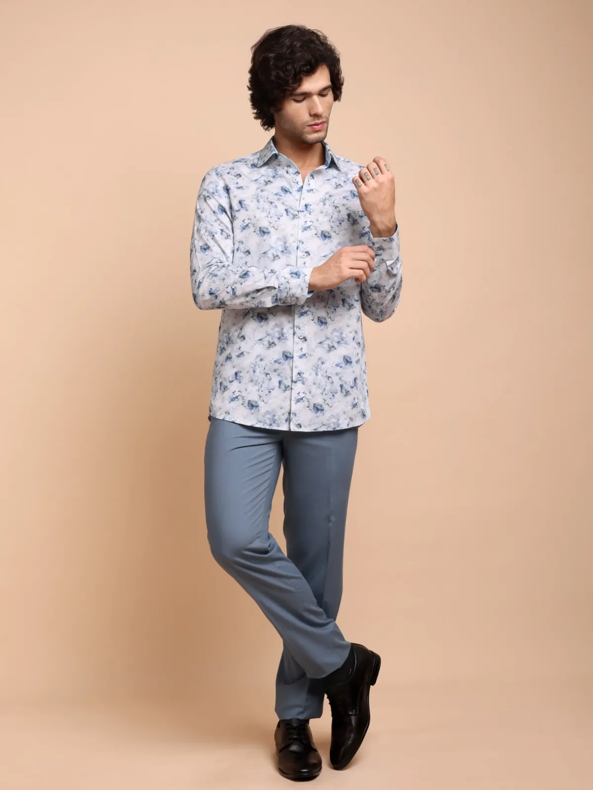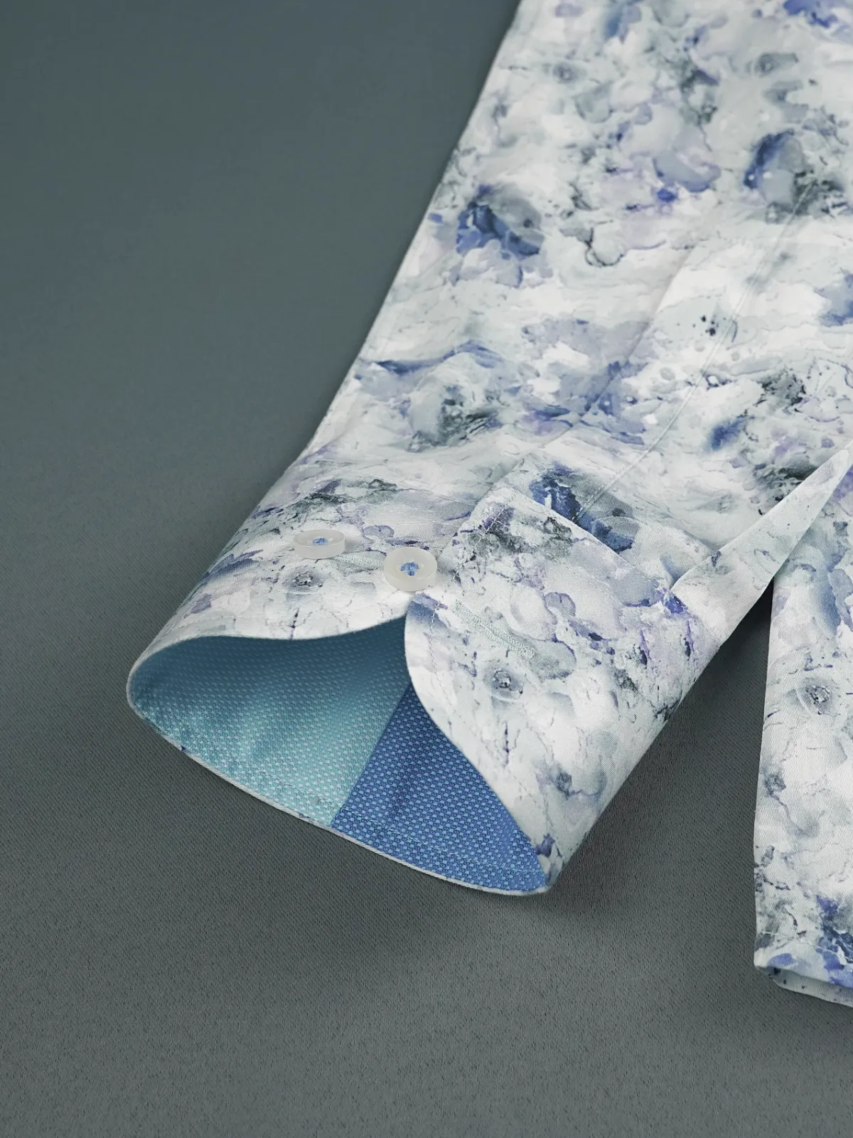 Spice up your wardrobe with this semi-casual shirt crafted from premium cotton featuring an awe inspiring abstract marble like print in muted blue and aqua green tones on white base. The inner, two tone band and cuffs add to the unique statement of the overall design.