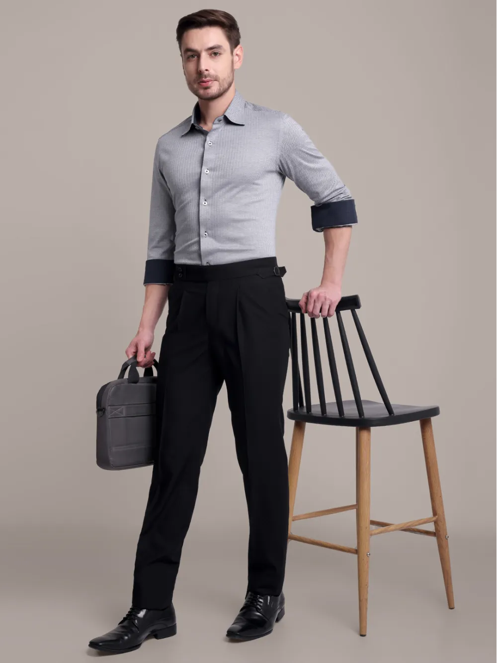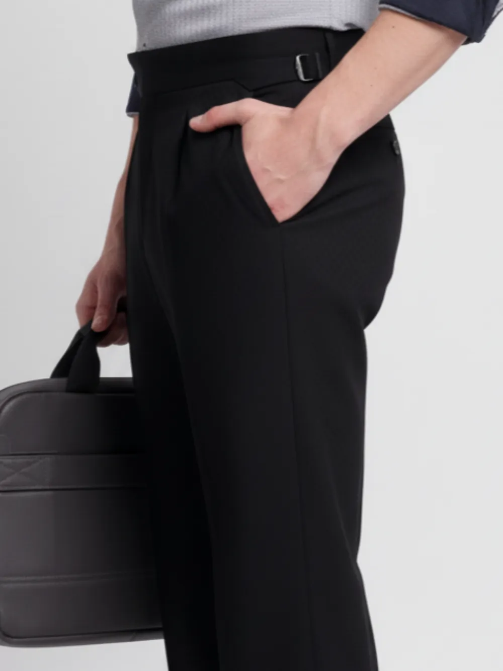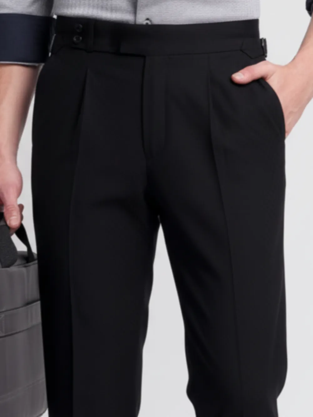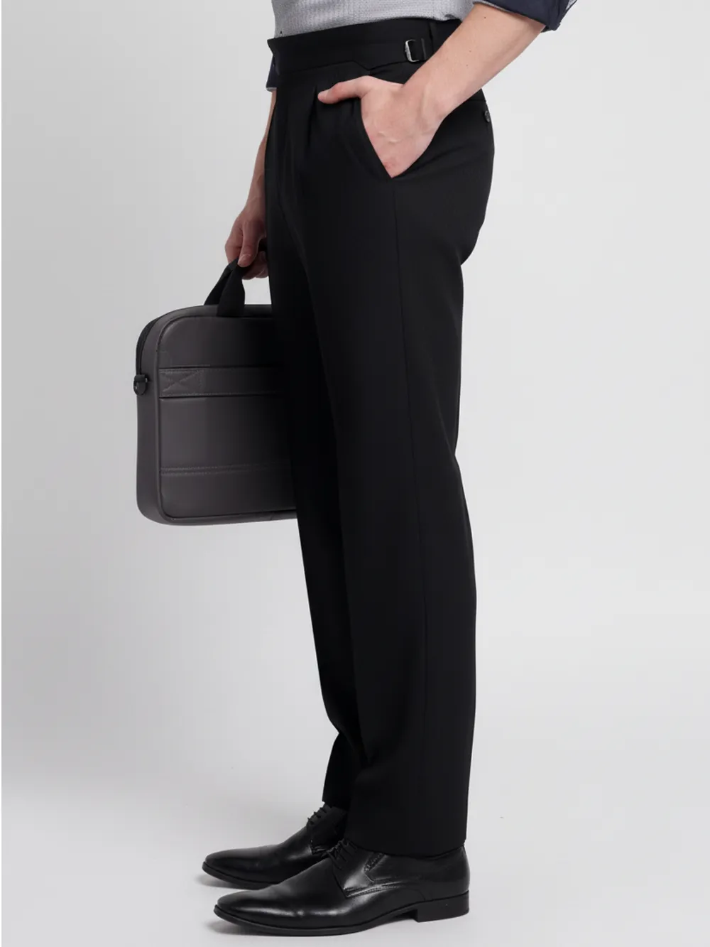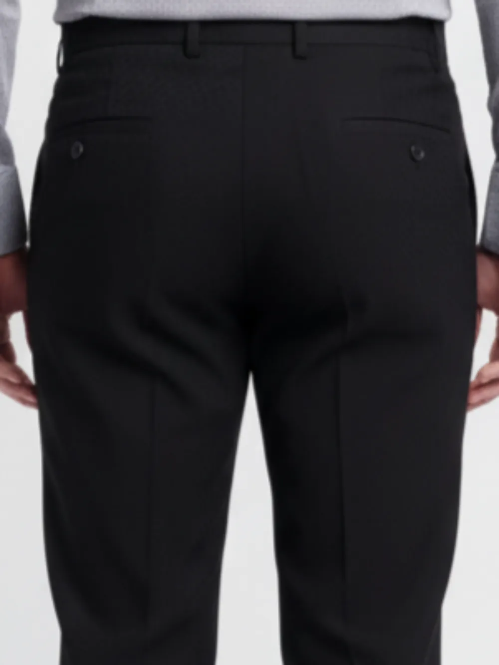 Refined and contemporary, these black tailored trousers are crafted for the modern gentleman. Designed with a flat front and adjustable side tabs for a precise fit, they offer a sleek silhouette ideal for both office and evening wear. The premium fabric ensures all-day comfort and wrinkle resistance, while the clean design pairs effortlessly with shirts and blazers for a sharp, sophisticated look.