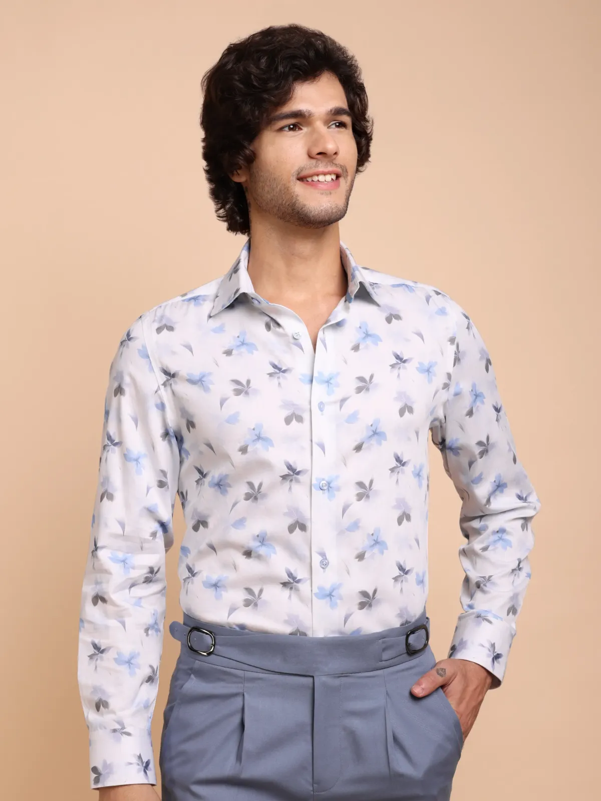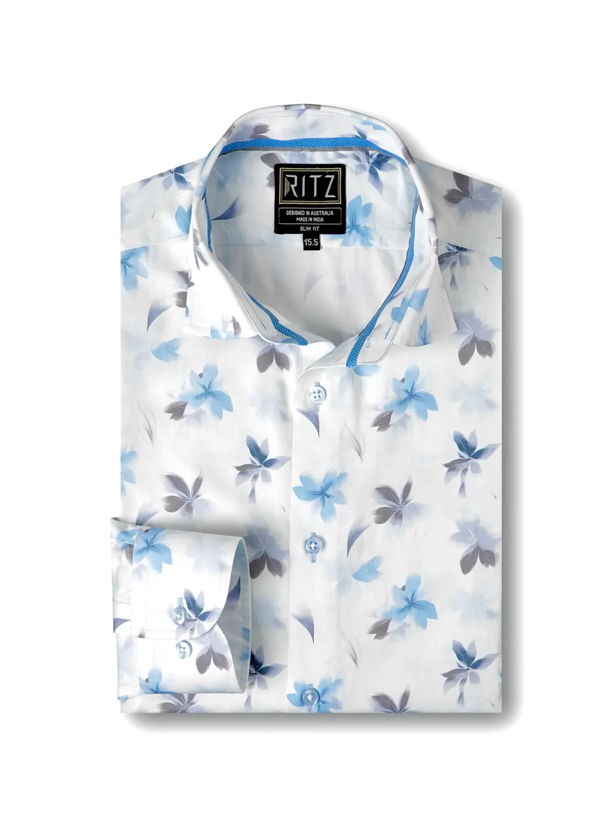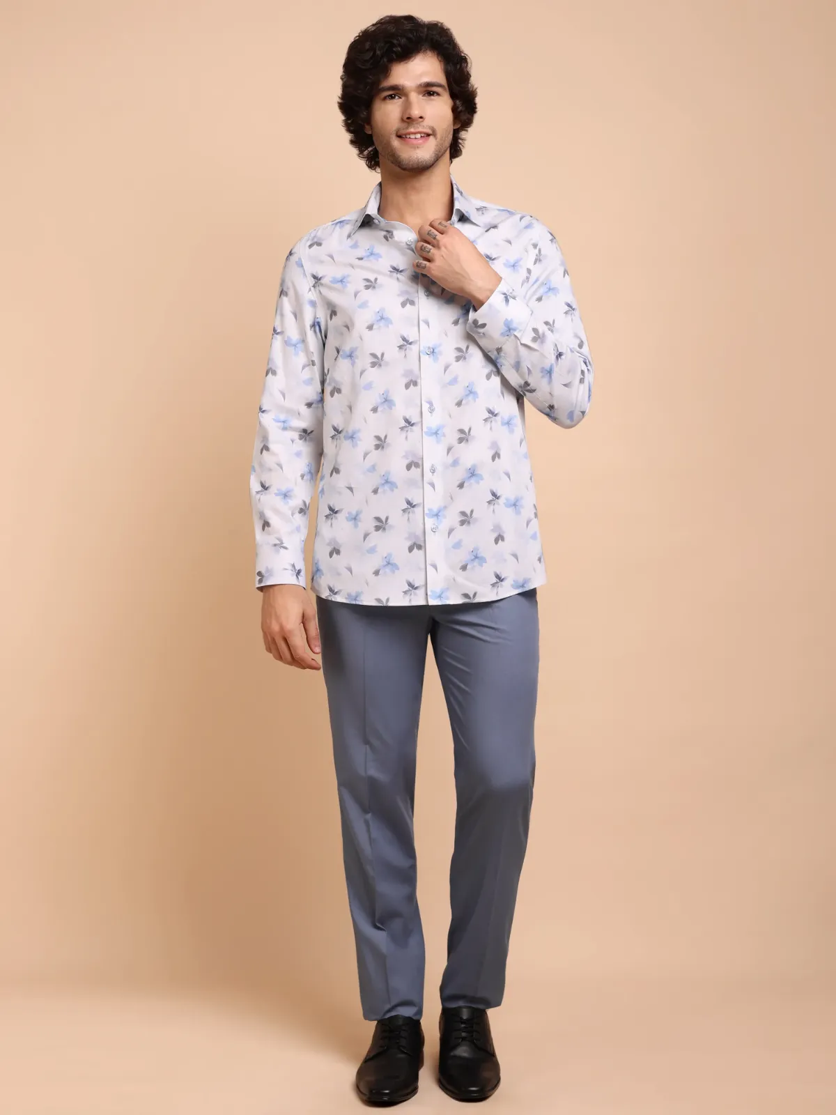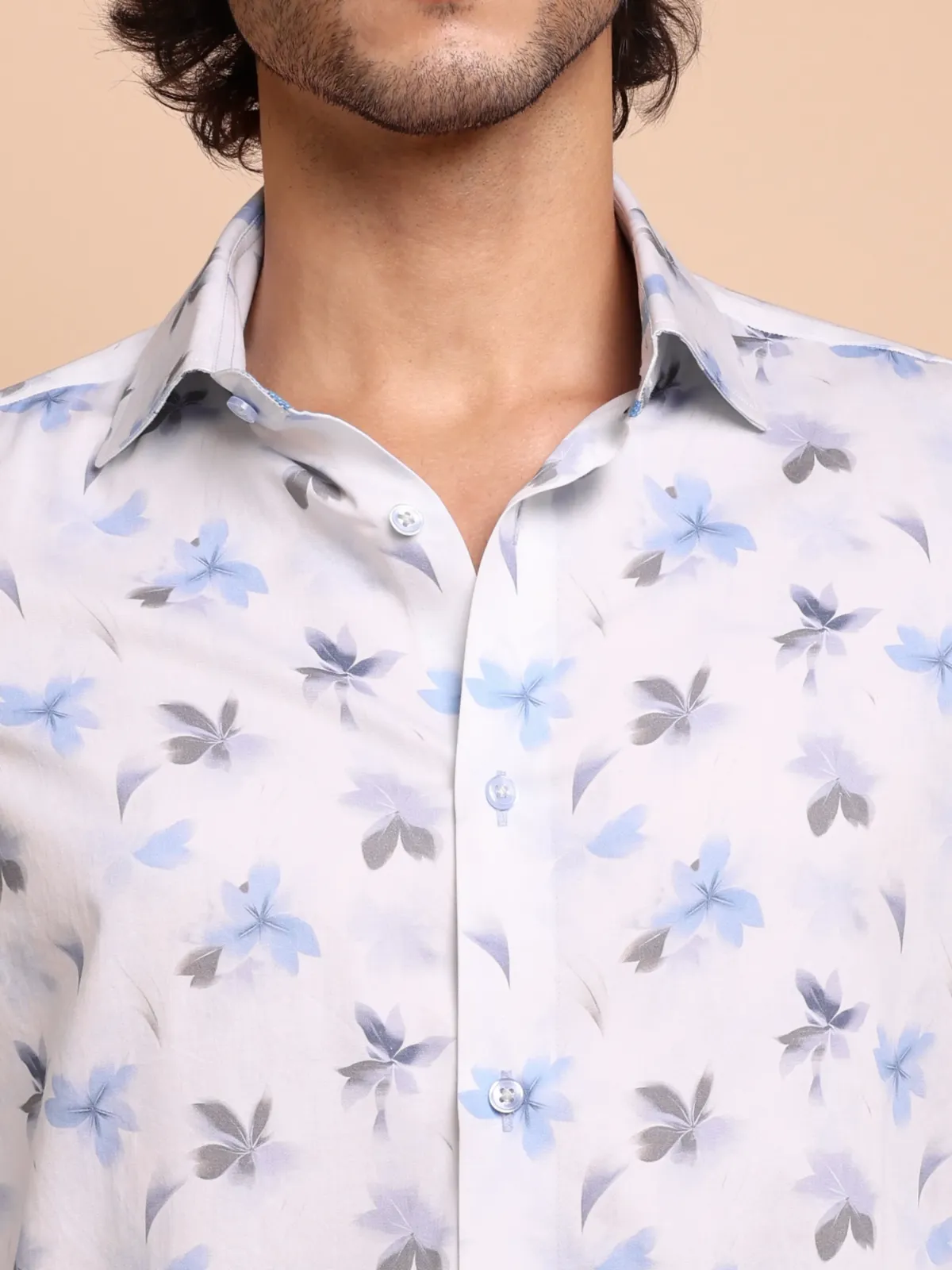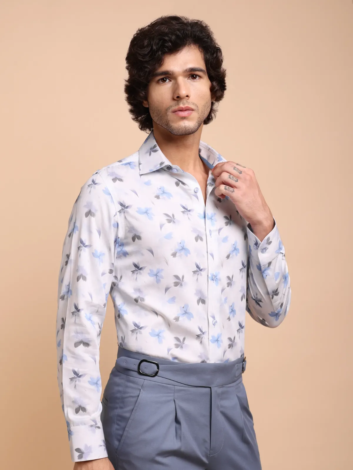 Nature has always inspired some of the greatest painters, sculptors and designers. Our bold floral white shirt with blue and grey flower print, showcasing subtle details on the inside collar band only forwards the age old tradition.
