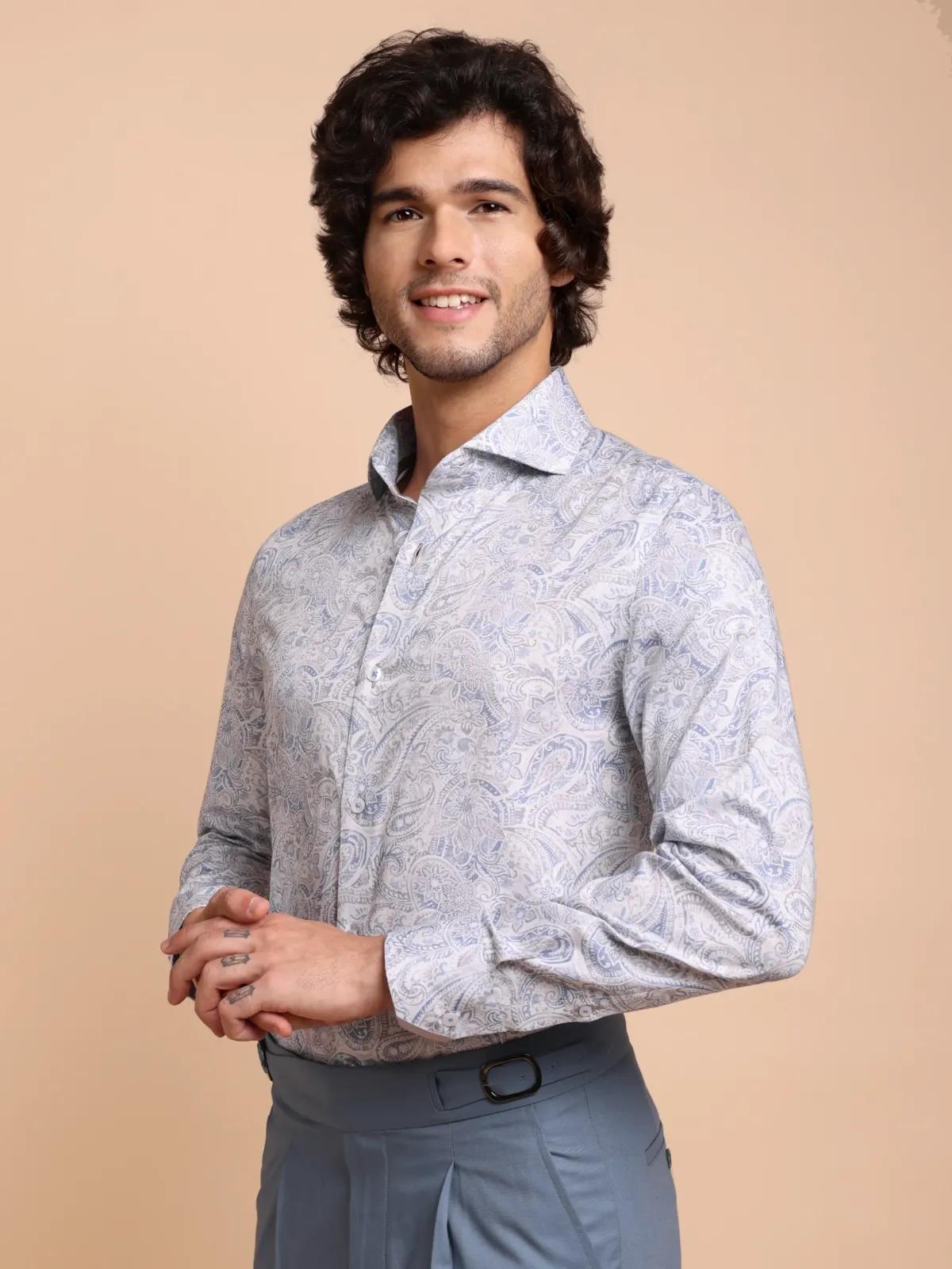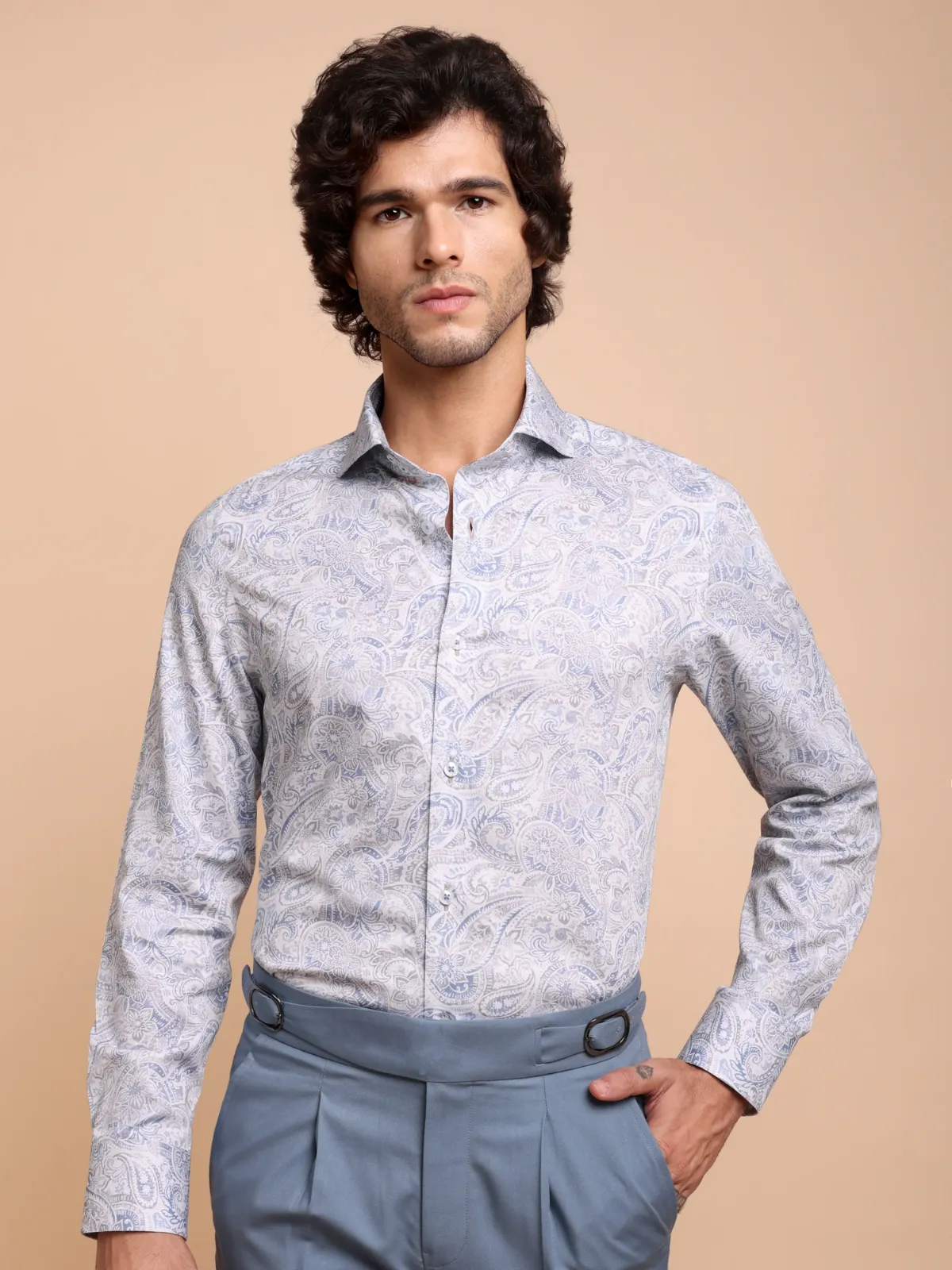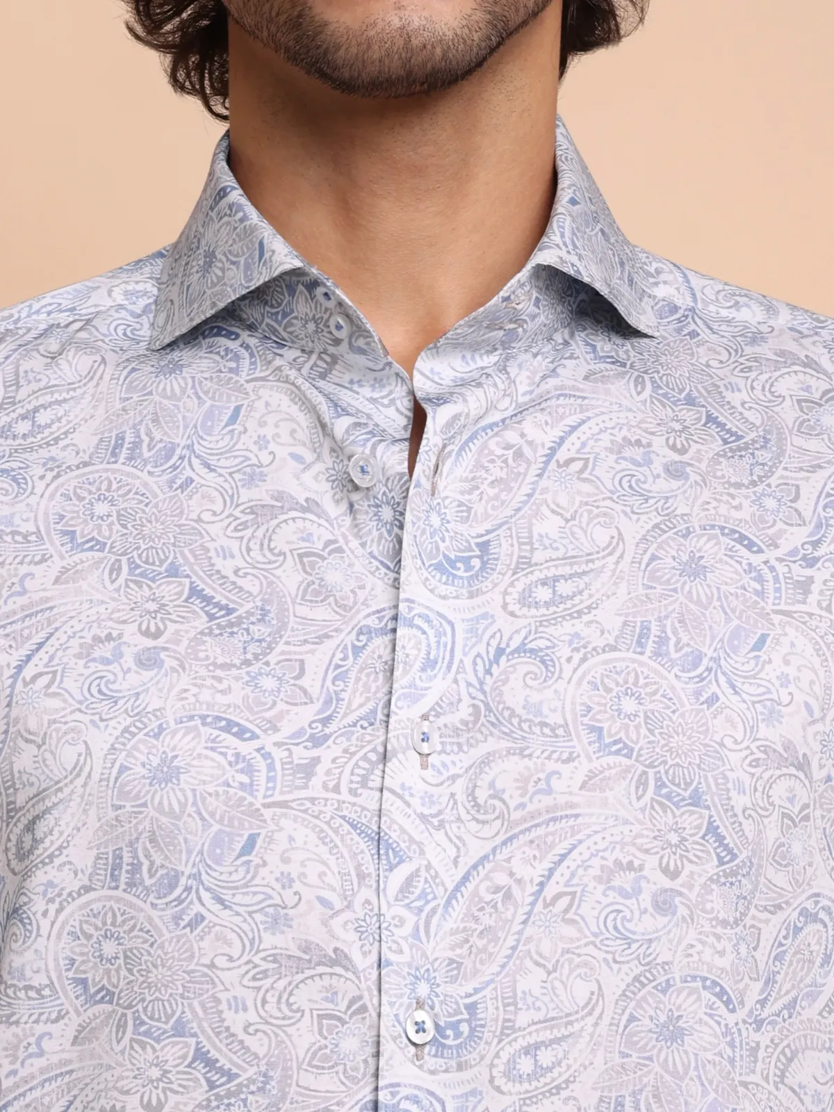 Elevate your wardrobe with this semi-casual shirt crafted from premium cotton featuring an intricate paisley and floral print in muted blue and soft taupe tones. The inner band and cuffs accents with contrast fabric adds to the unique statement of the overall design.