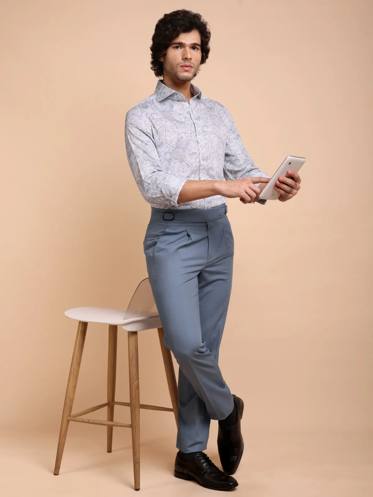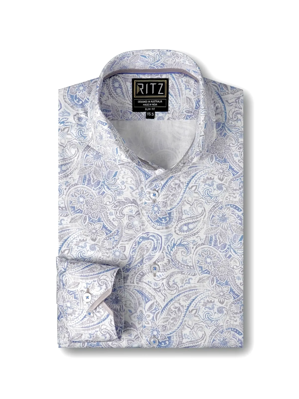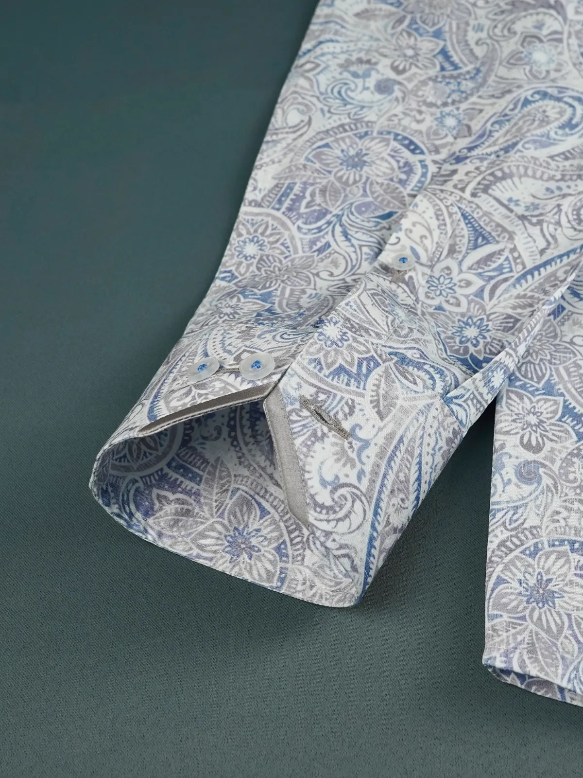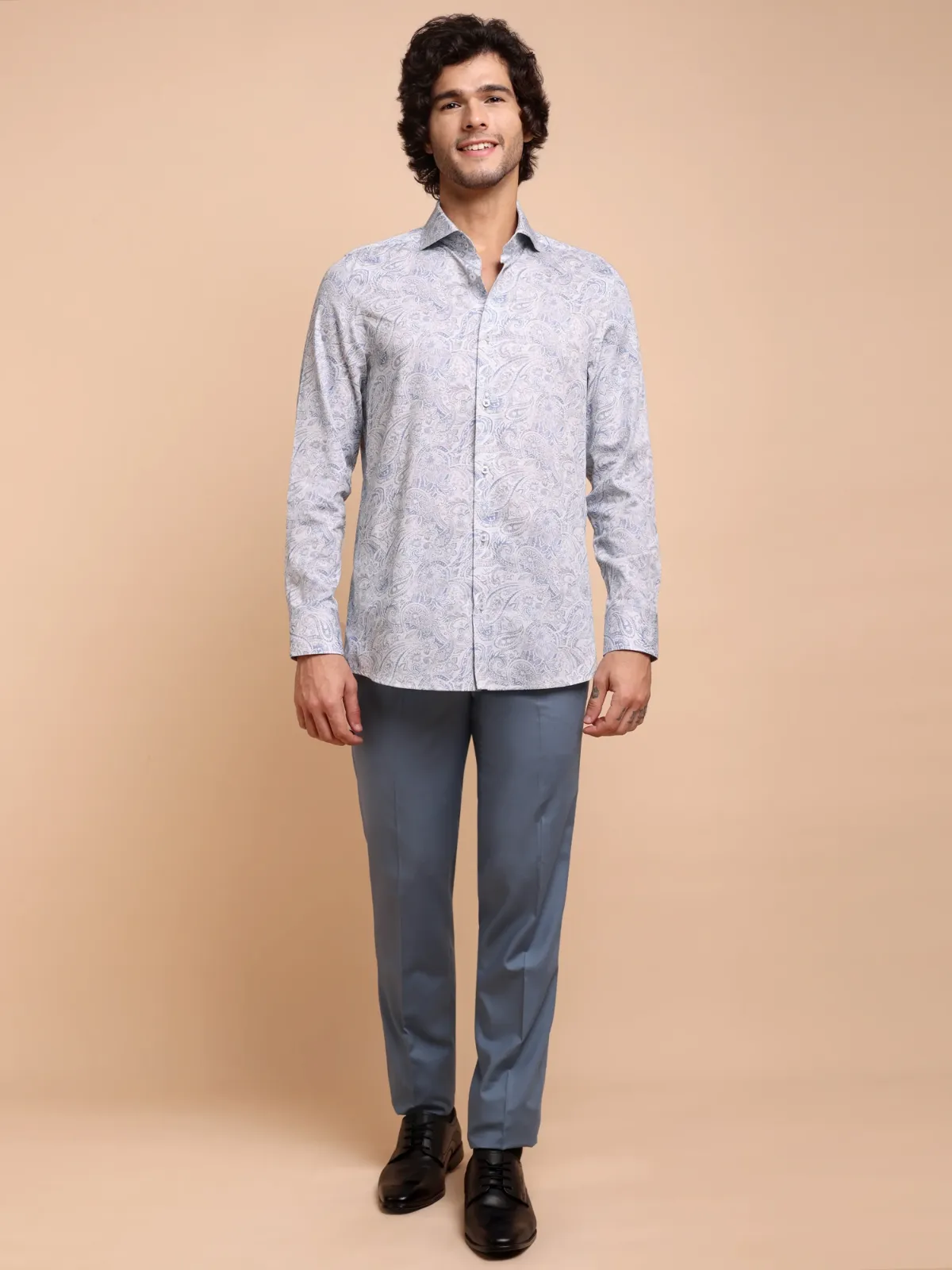 Elevate your wardrobe with this semi-casual shirt crafted from premium cotton featuring an intricate paisley and floral print in muted blue and soft taupe tones. The inner band and cuffs accents with contrast fabric adds to the unique statement of the overall design.