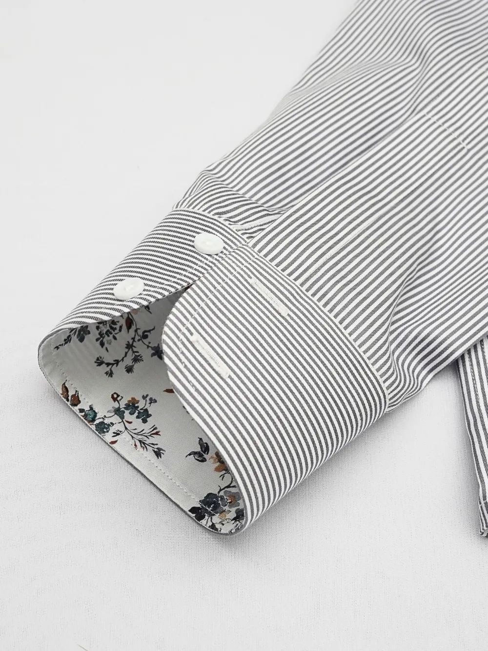 The Jacquard weave 100% cotton shirt is a classic and versatile wardrobe staple, showcasing elegant white and gray pin stripes blended with floral inner band, cuffs and button placket accent.