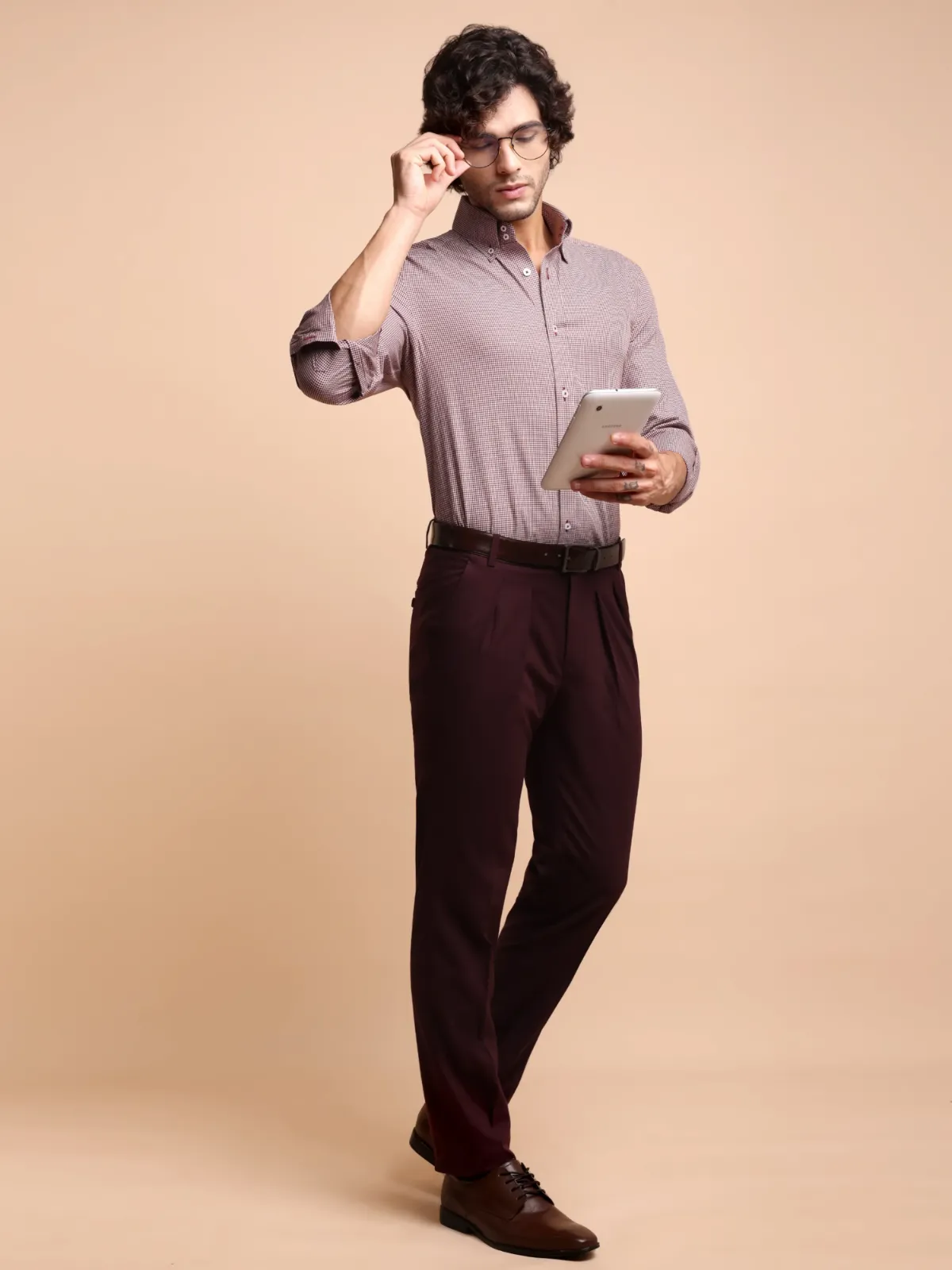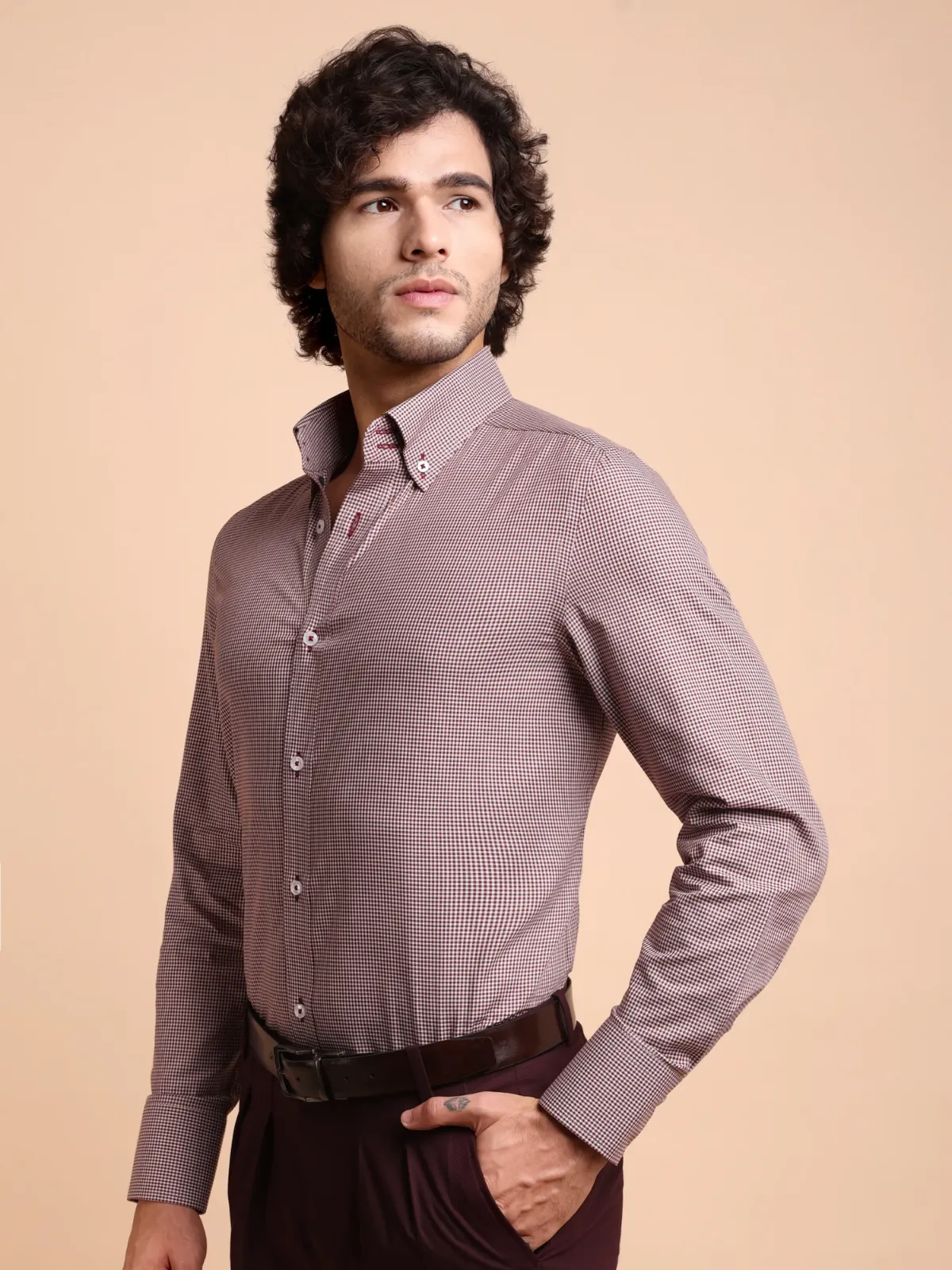 This shirt boasts of maroon and white grid, finely woven with a classic twill weave that showcases hound’s tooth pattern that is well appreciated across the world. The wider button down collar points and broader cuffs create a bolder look, while the combination of classic colours keeps the elegant statement intact.