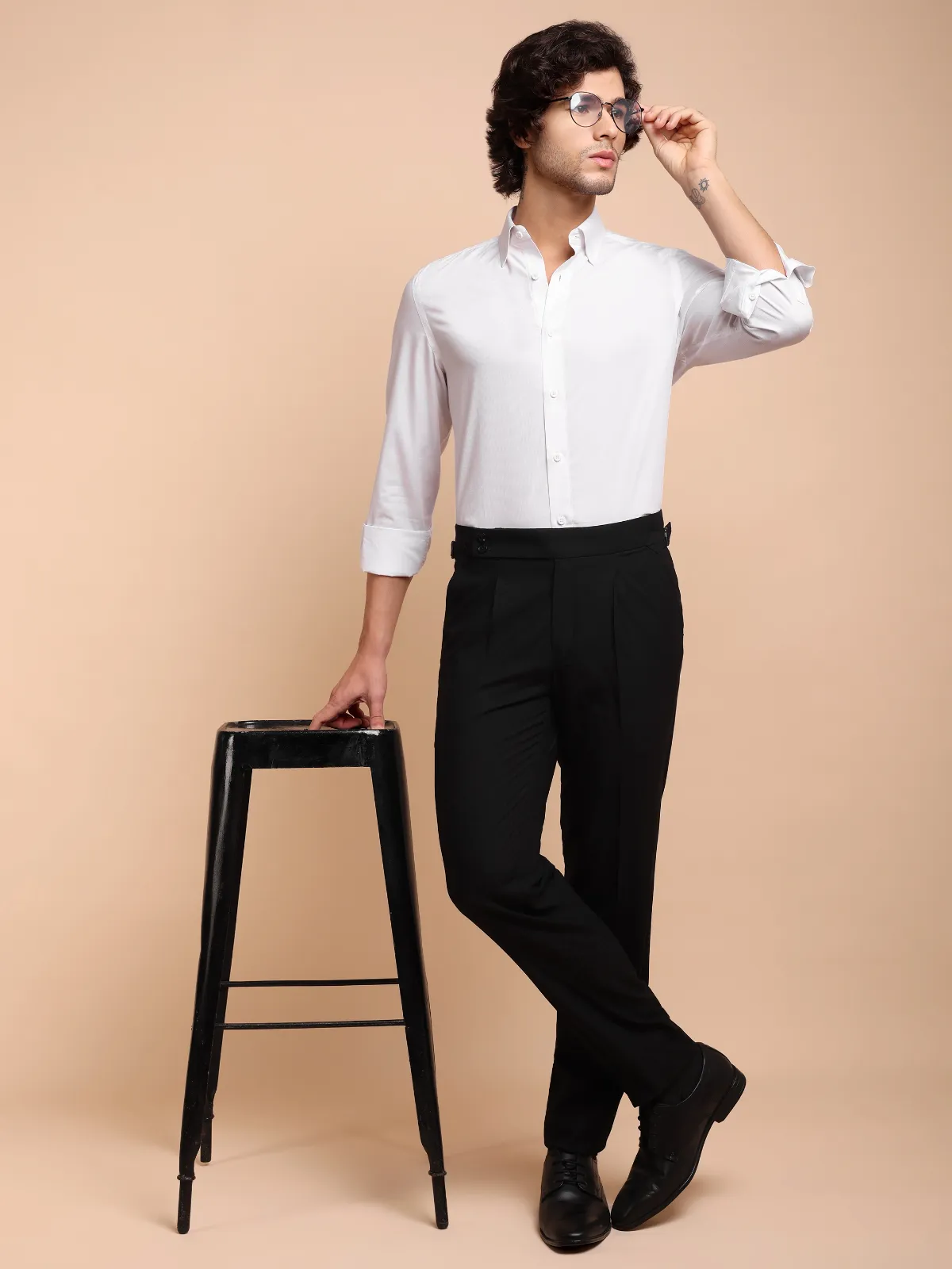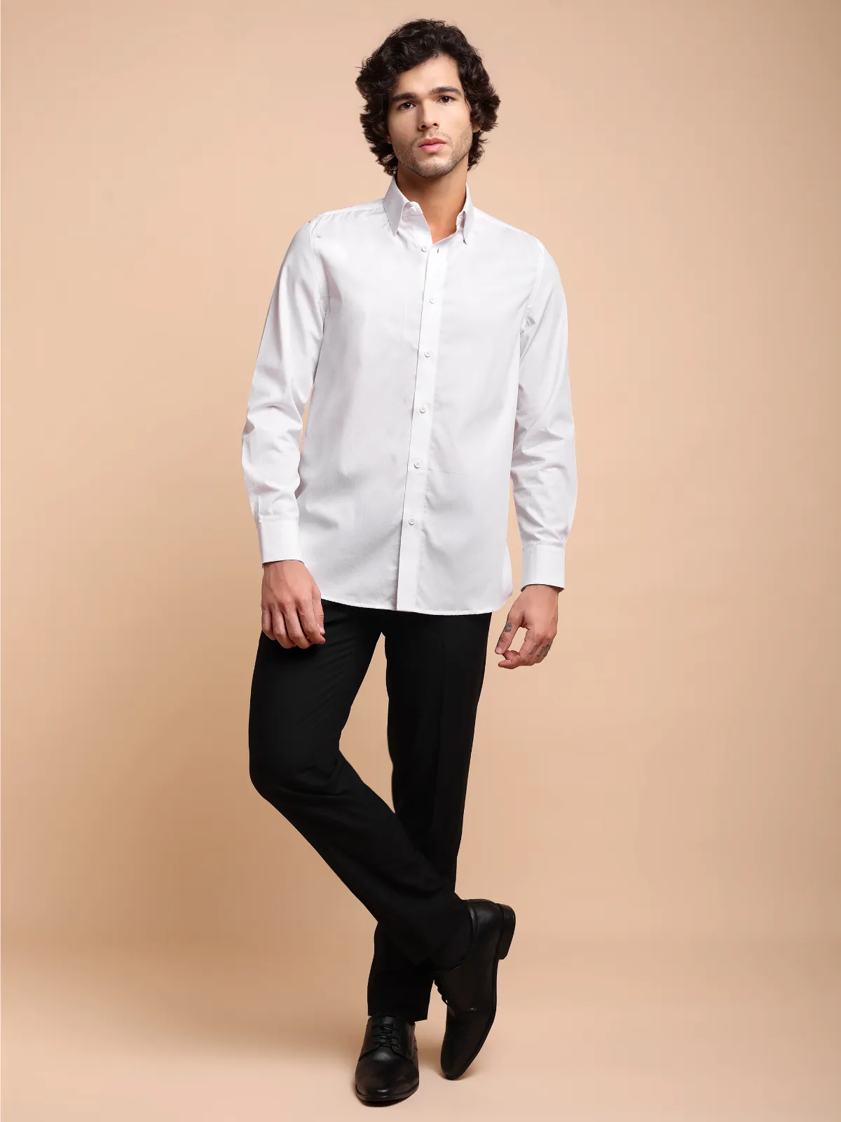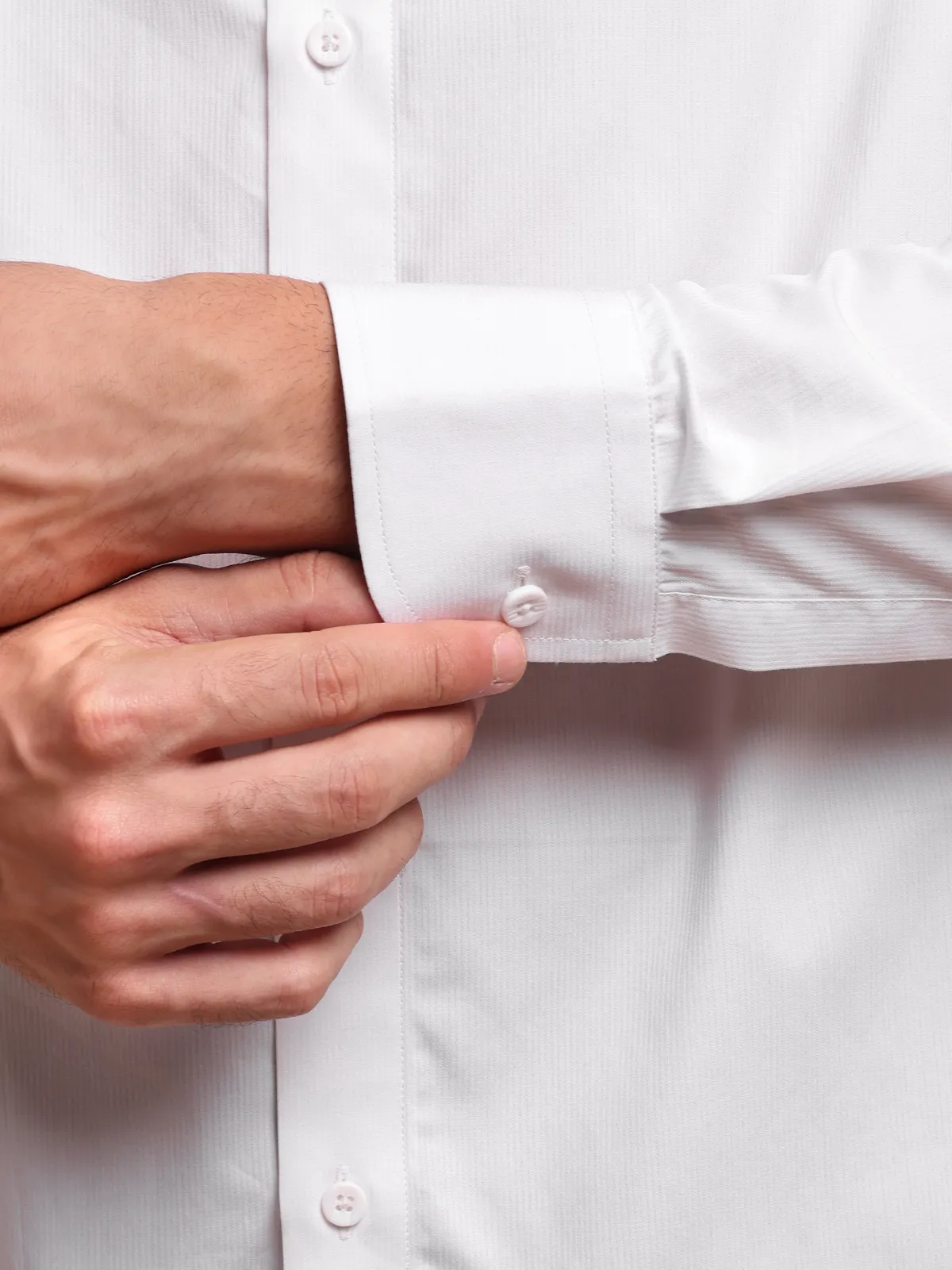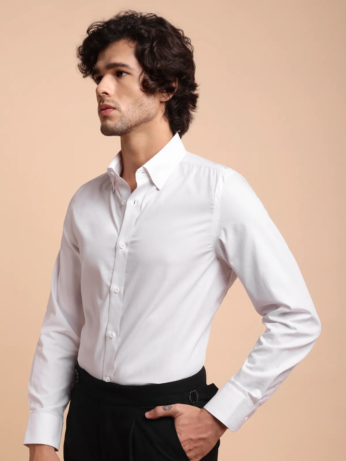 Experience refined style with our luxury pure cotton white dress shirt showcasing distinct self pinstripes. Expertly crafted for comfort and elegance, it offers a timeless silhouette, perfect for formal occasions or sophisticated everyday wear.