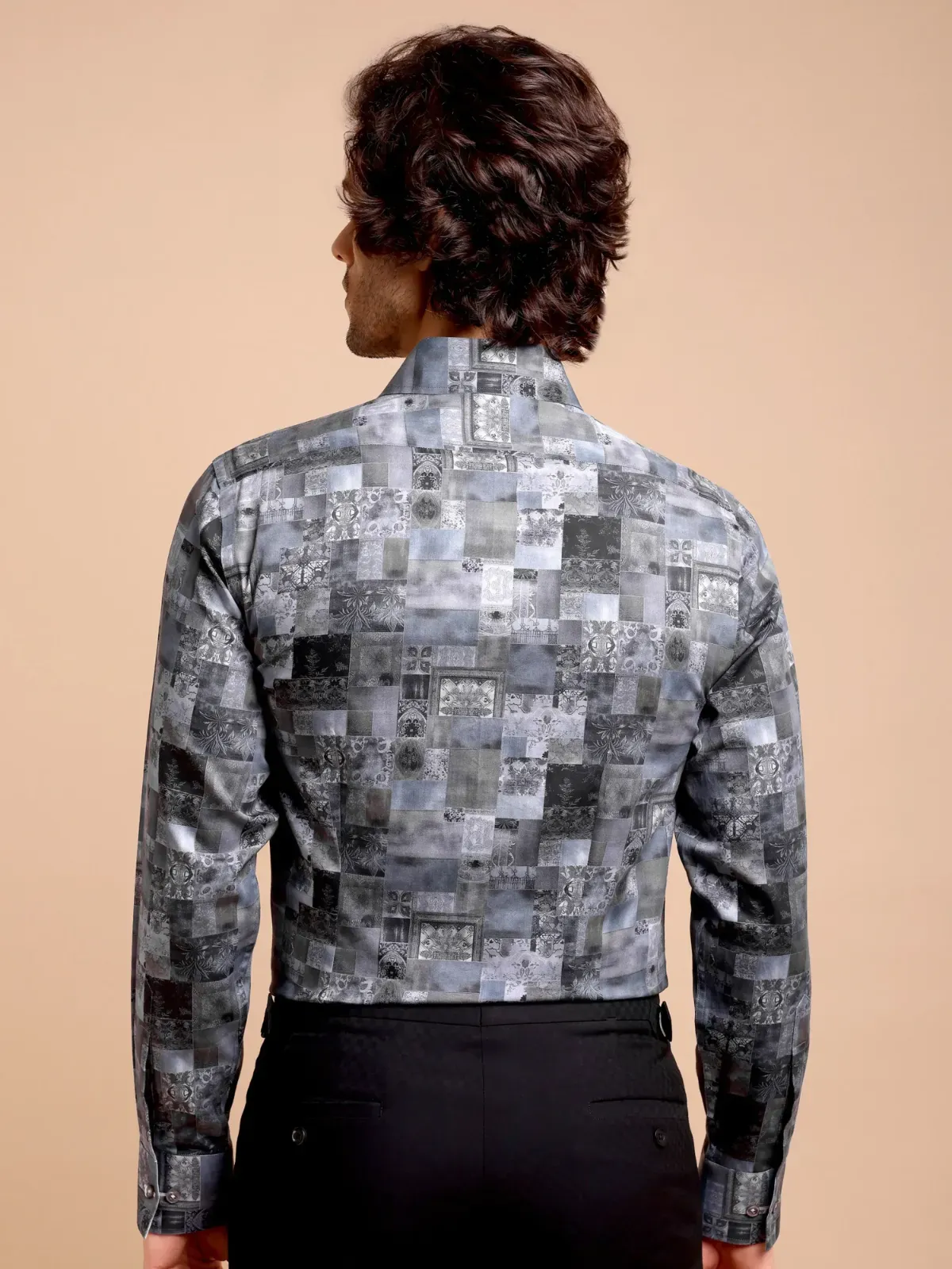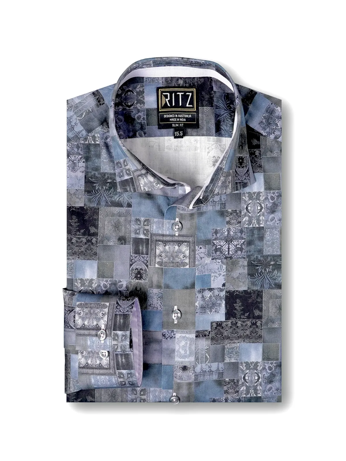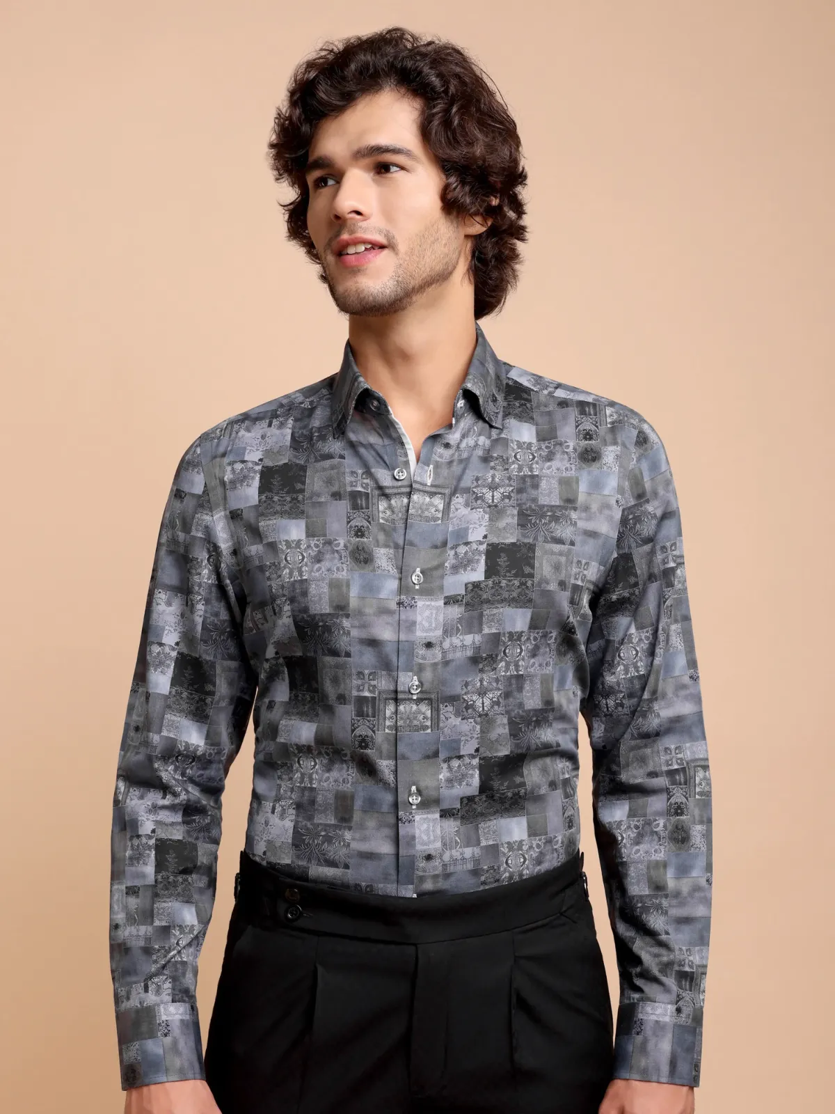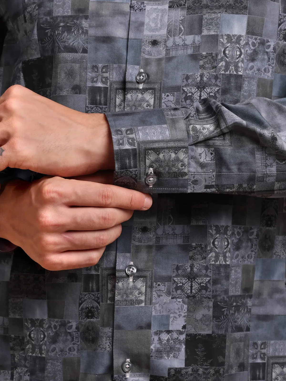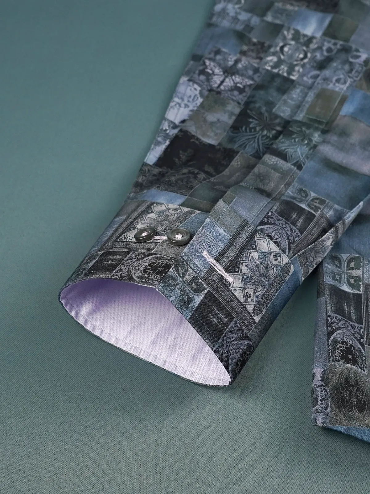 Our abstract patches shirt showcasing purple, black and blue hues, is most suitable for a workwear upgrade or weekend outings. Embellished with purple contrast details, this shirt is a true designer masterpiece.