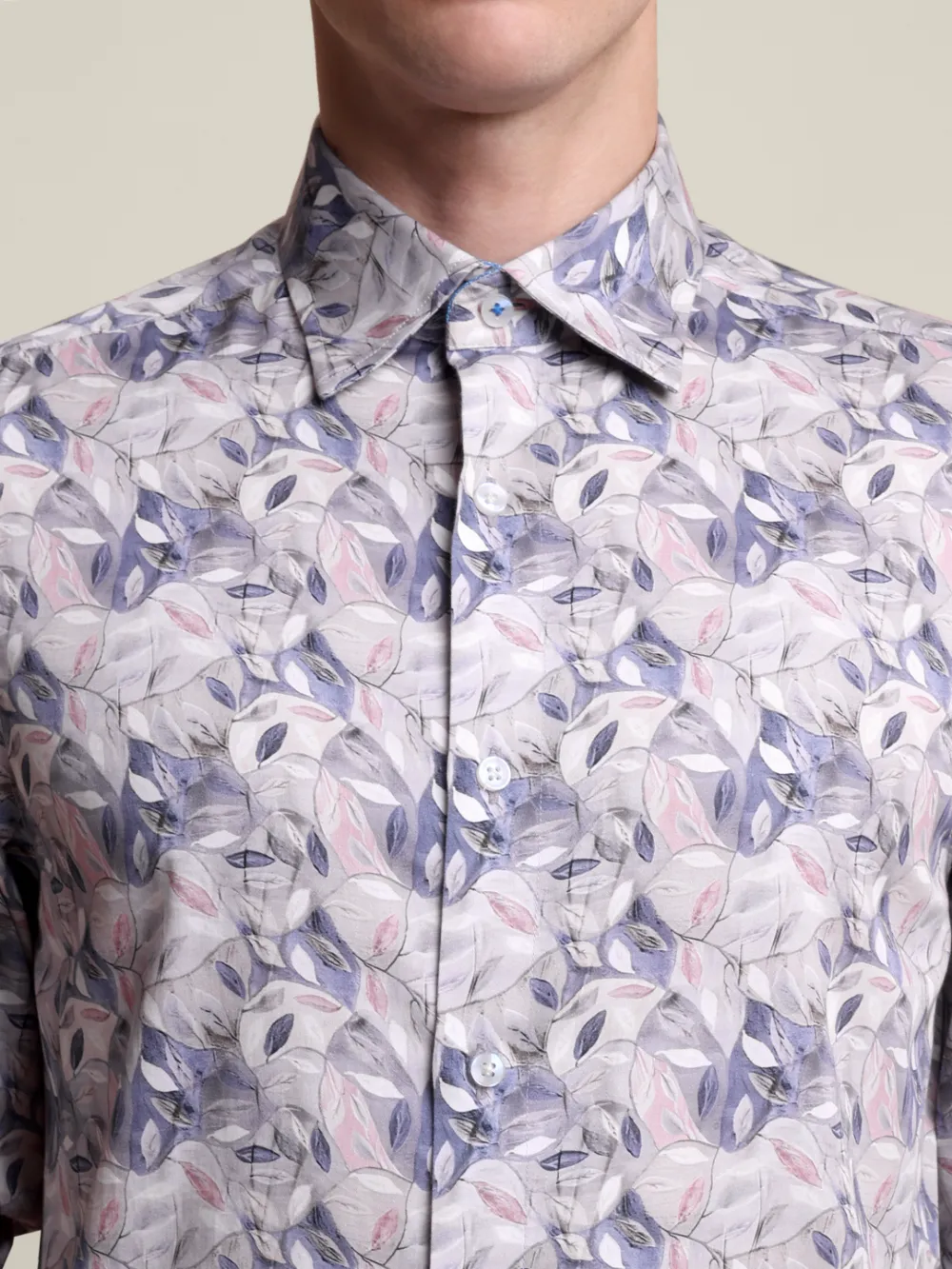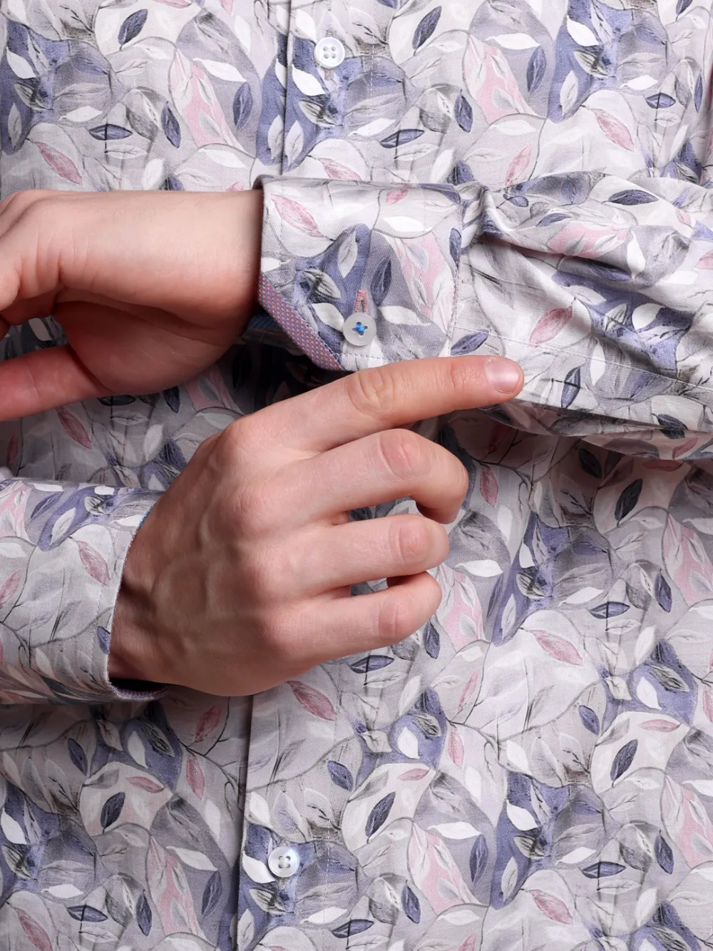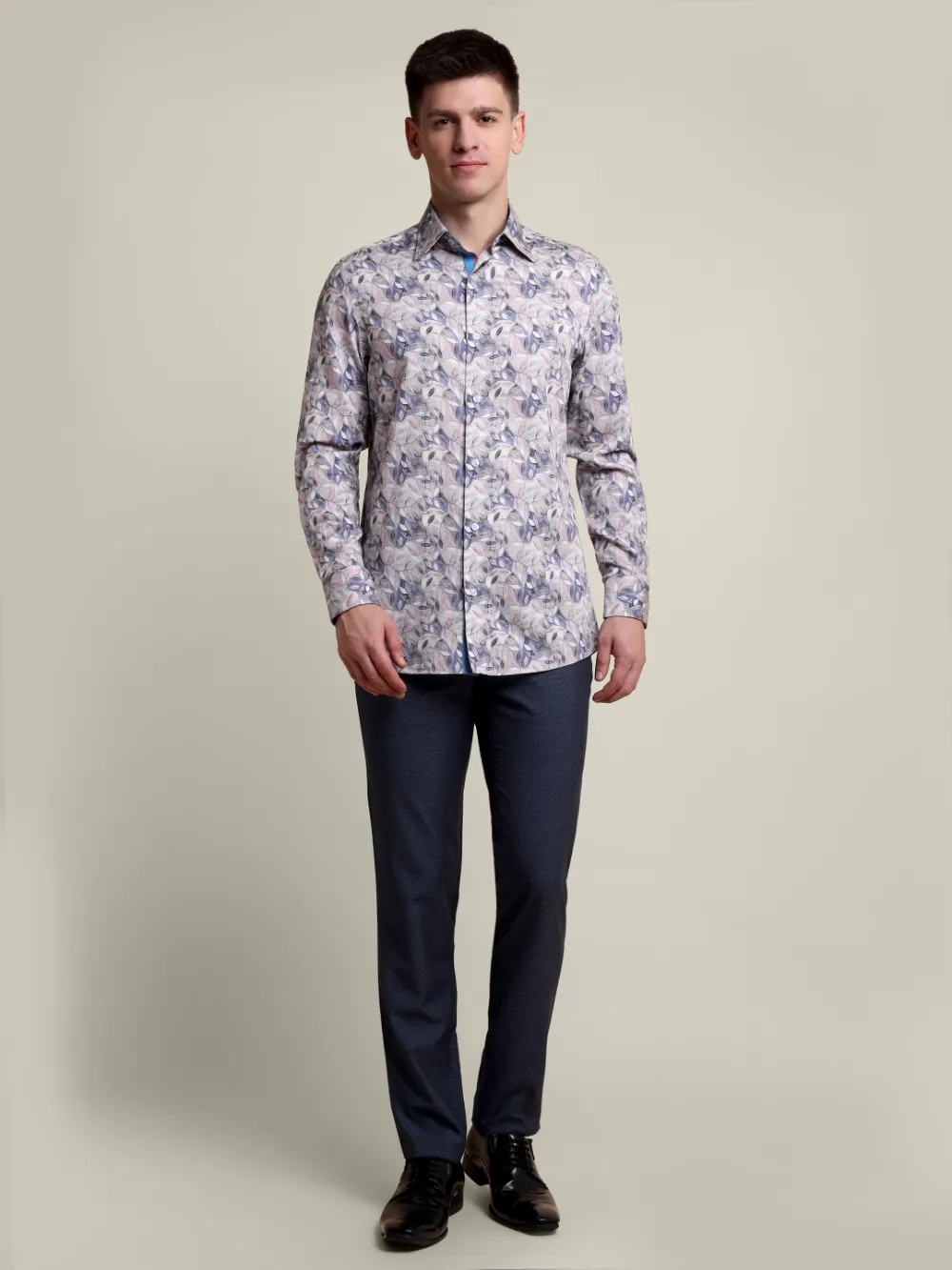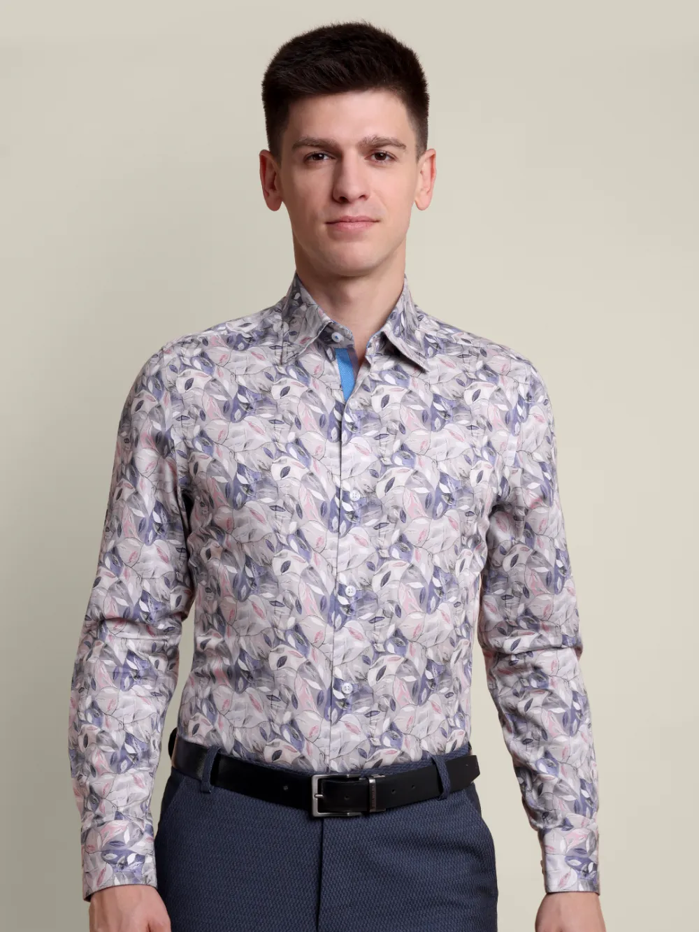 Embrace elegance with our pure cotton plain weave shirt, featuring an abstract leaf pattern and unique lavender and blue fabric accents. Soft, breathable, and expertly tailored, it offers style with a nature-inspired twist.