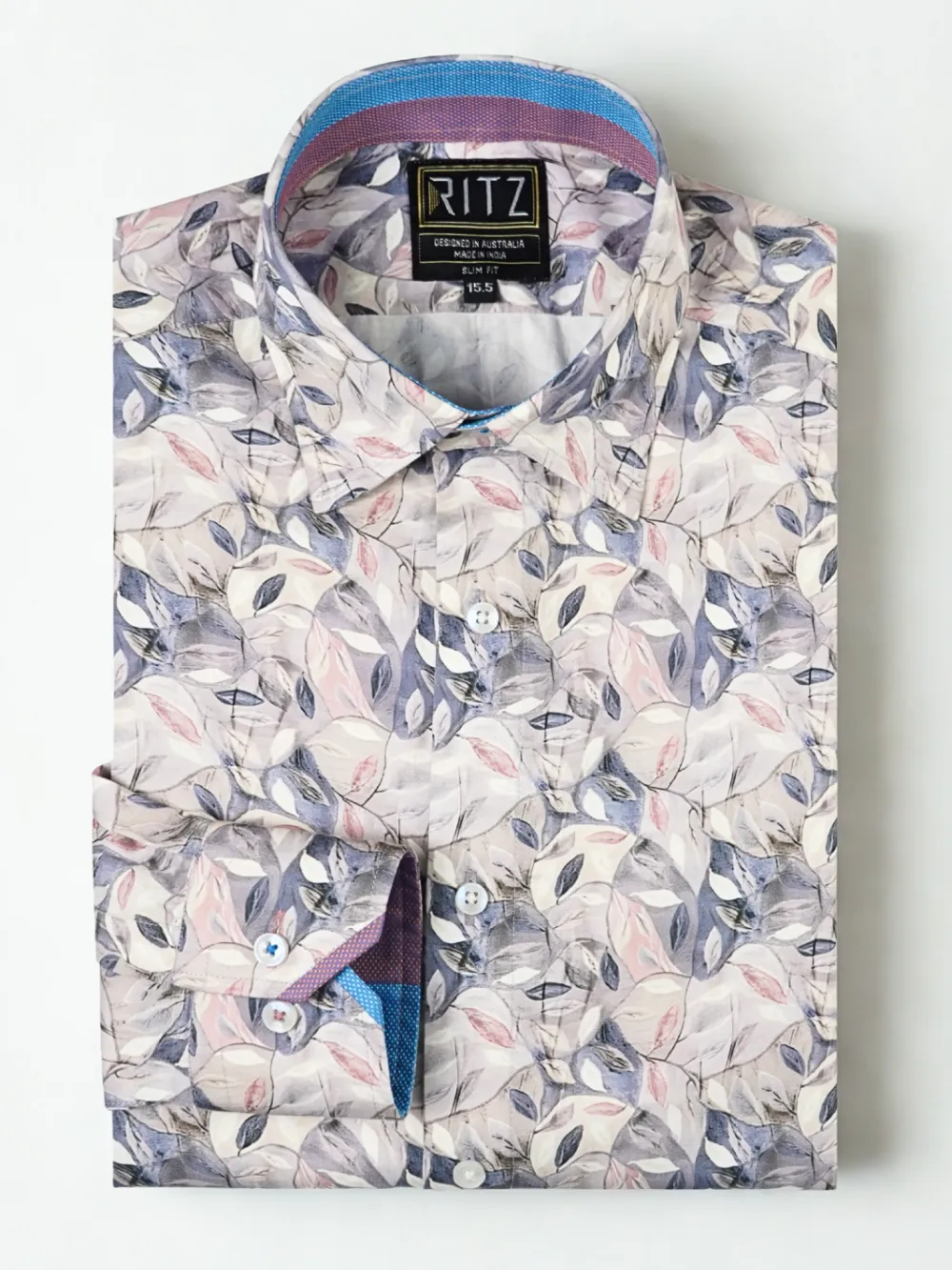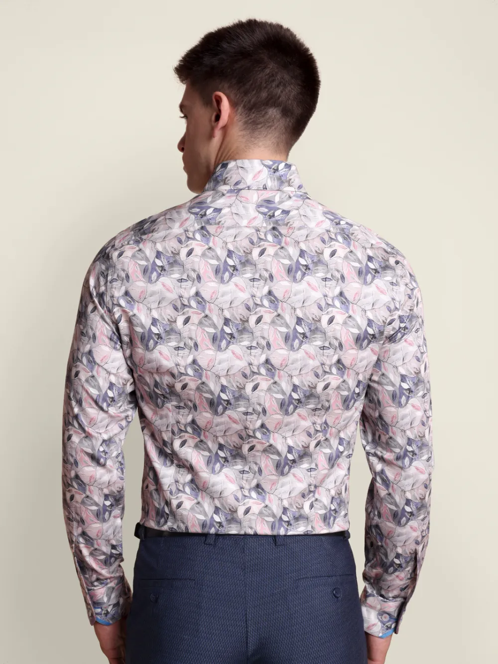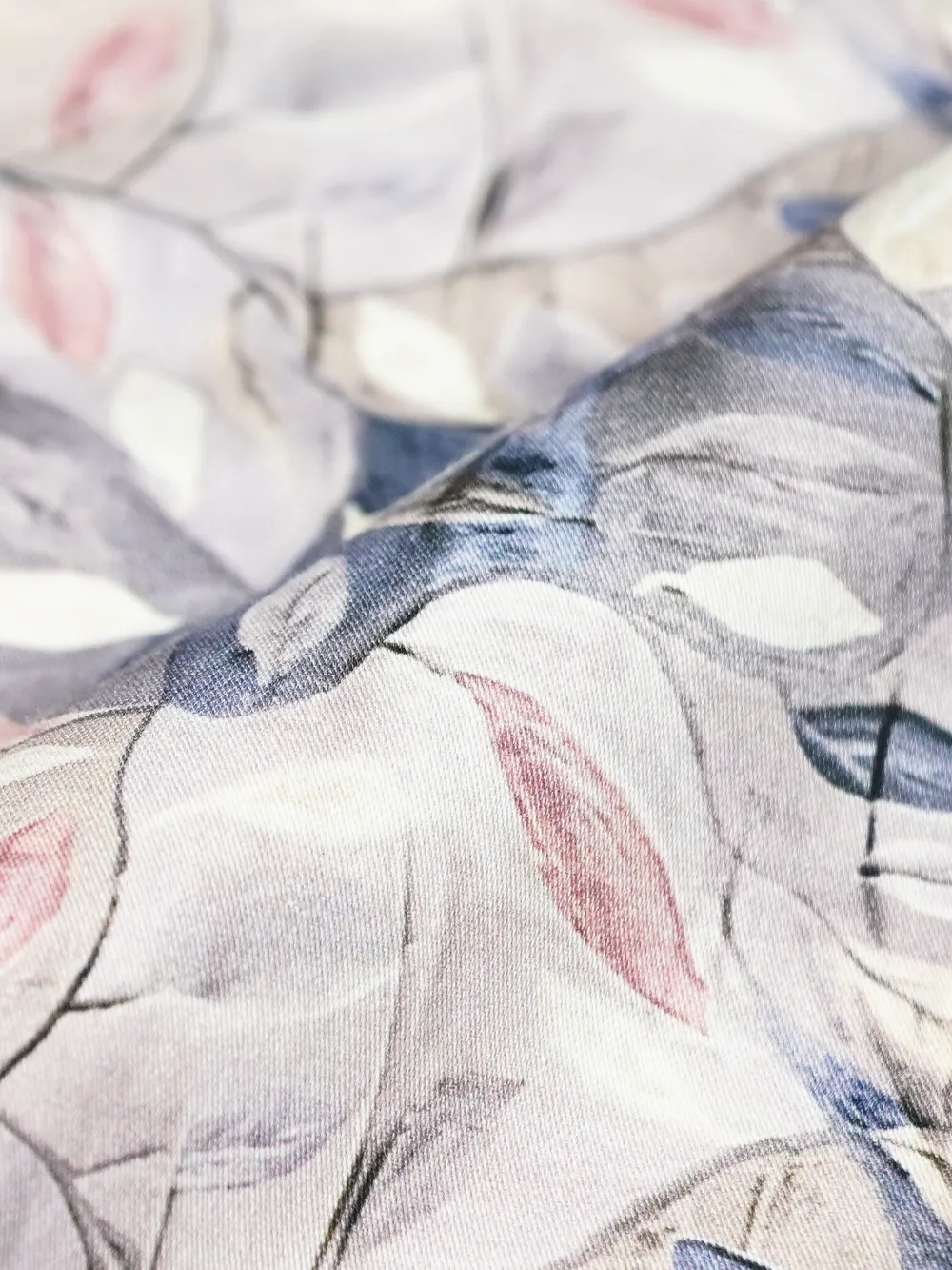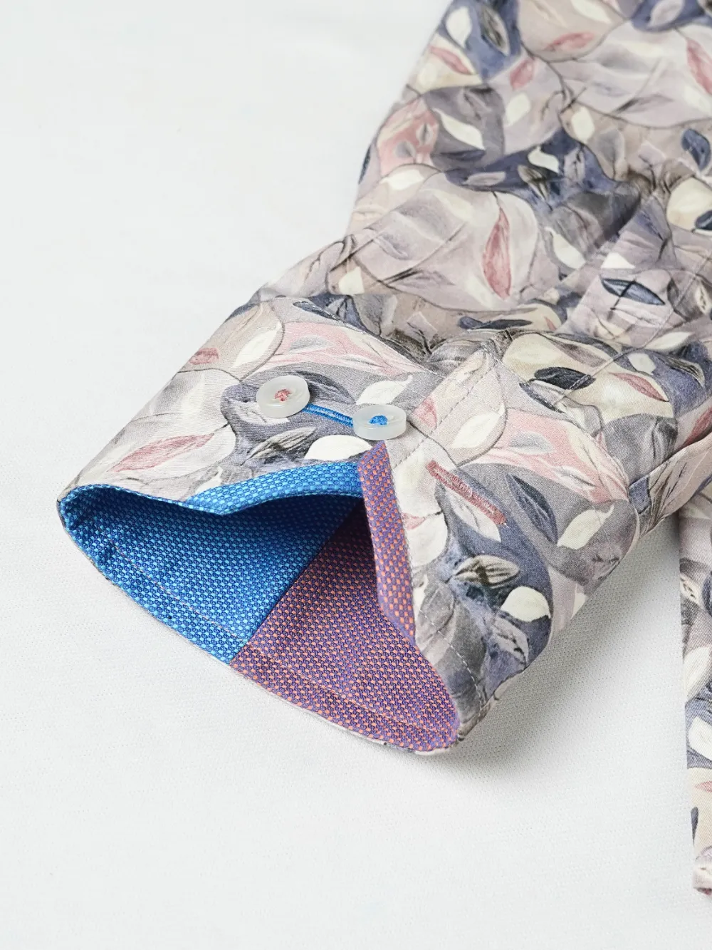 Embrace elegance with our pure cotton plain weave shirt, featuring an abstract leaf pattern and unique lavender and blue fabric accents. Soft, breathable, and expertly tailored, it offers style with a nature-inspired twist.