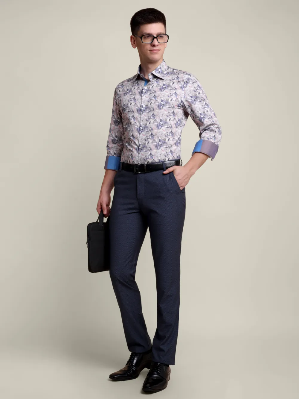 Step into refined sophistication with our premium pure cotton plain weave shirt, designed to blend nature’s beauty with modern craftsmanship. The abstract leaf pattern, woven into soft, breathable cotton, adds a subtle yet artistic flair to your wardrobe. Unique lavender and blue fabric accents on the collar, cuffs, and placket bring a touch of individuality, perfectly complementing the serene tones of the design.