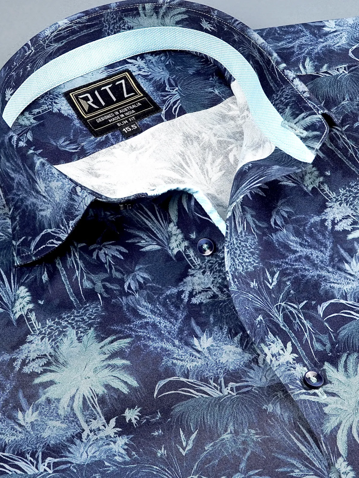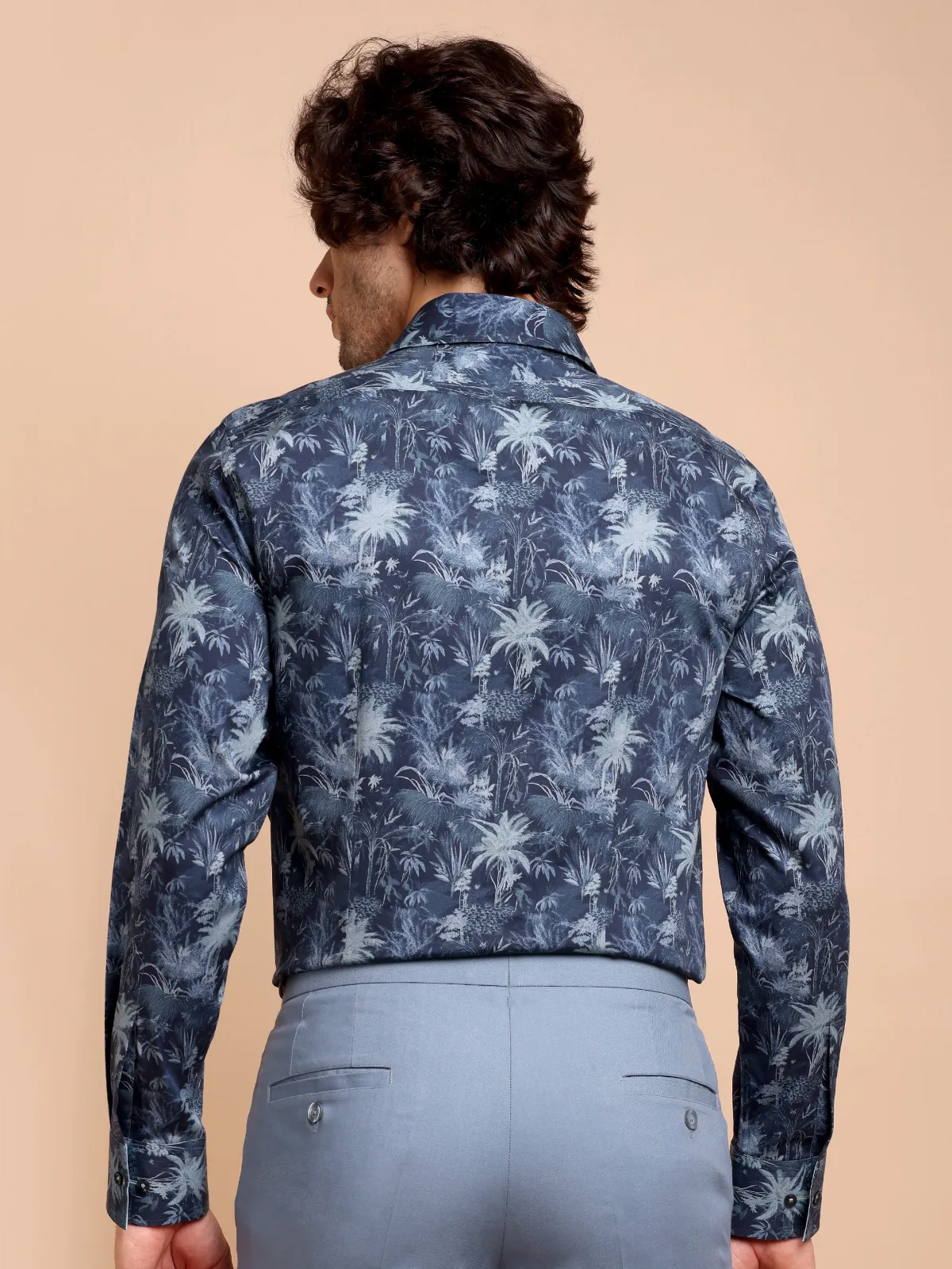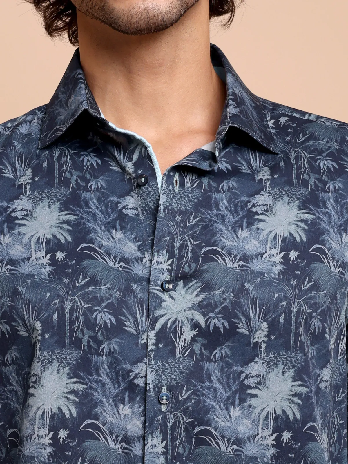 Our abstract print – mimicking night forest with indigo and sky colour shirt is most suitable for a workwear upgrade or weekend outings. Embellished with contrast details, this shirt is a true designer masterpiece.