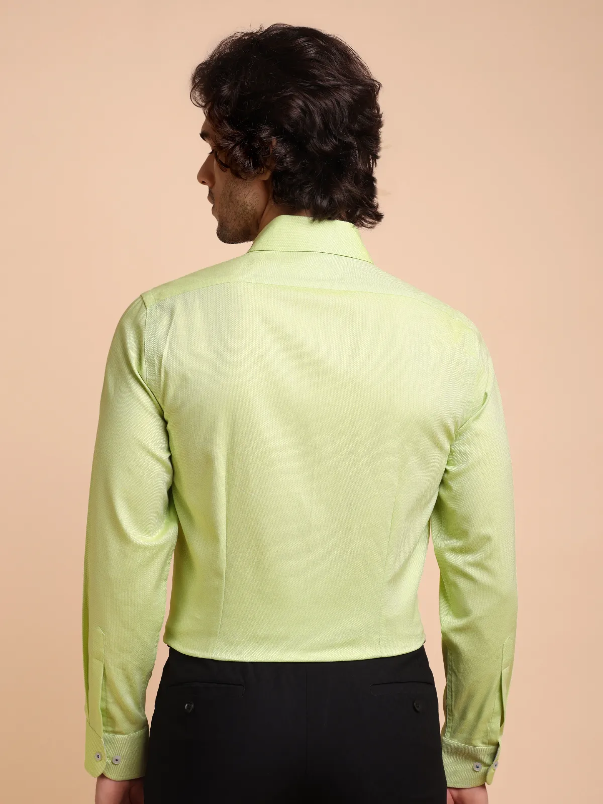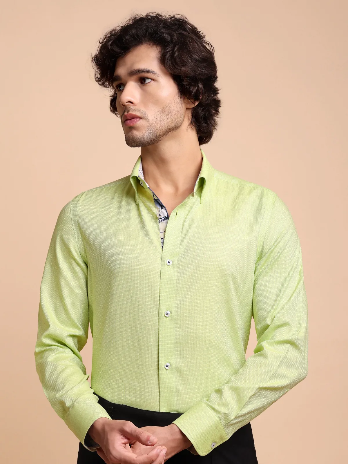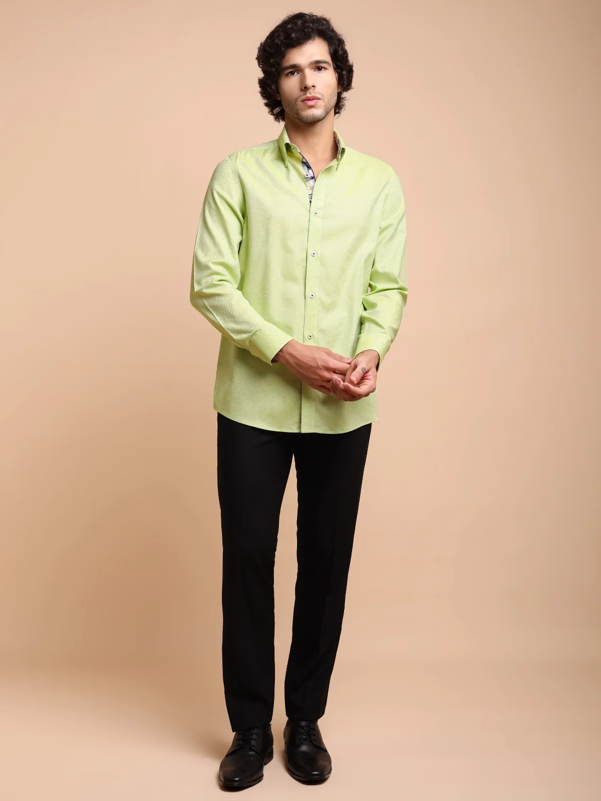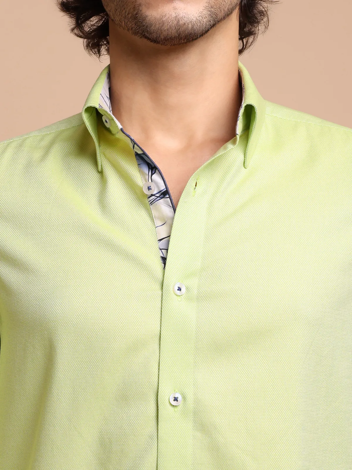 Immerse yourself in sophisticated style with this pure cotton Oliveine shirt, showcasing subtle Dobby Weave. Uniquely crafted collar, cuffs and button placket using contrast checked fabric, complementing the base fabric colour, redefines the conventional elegance.