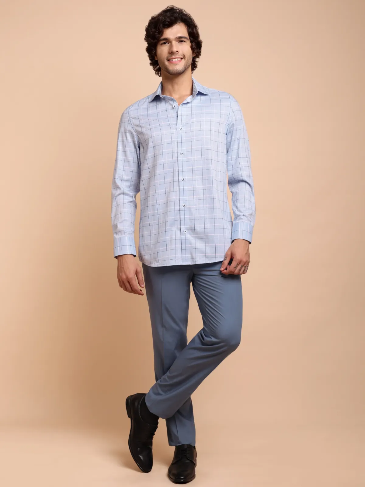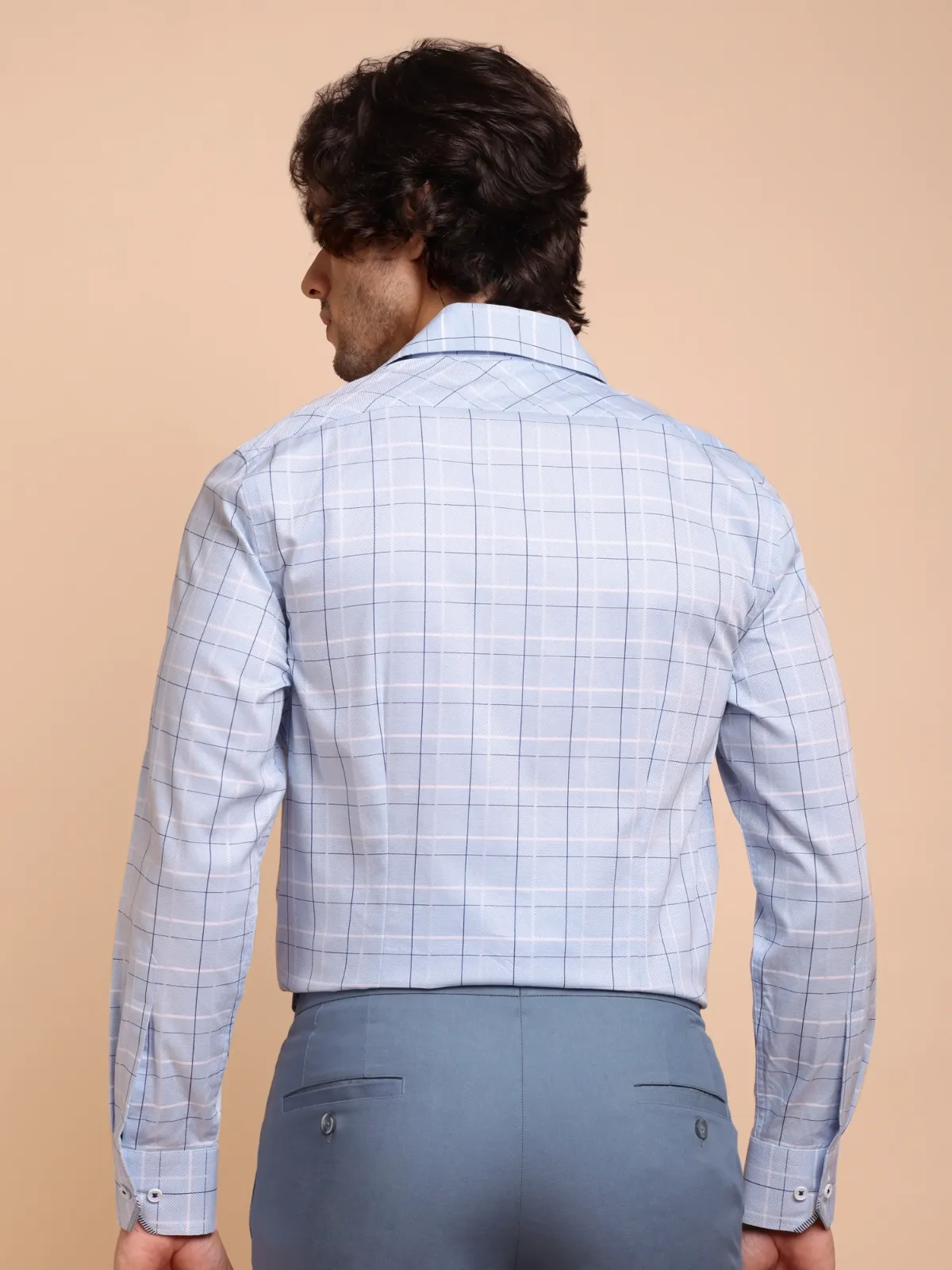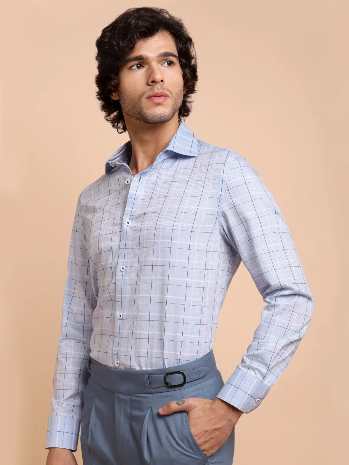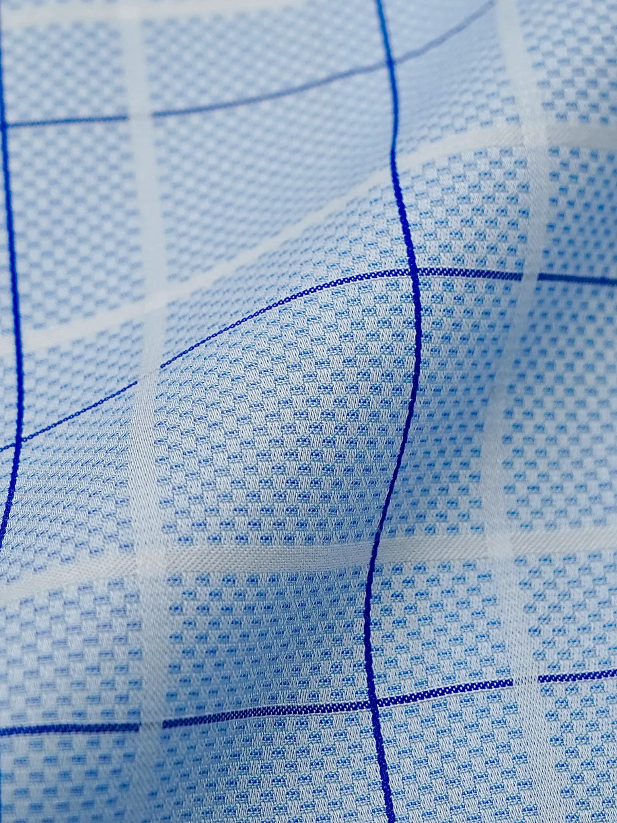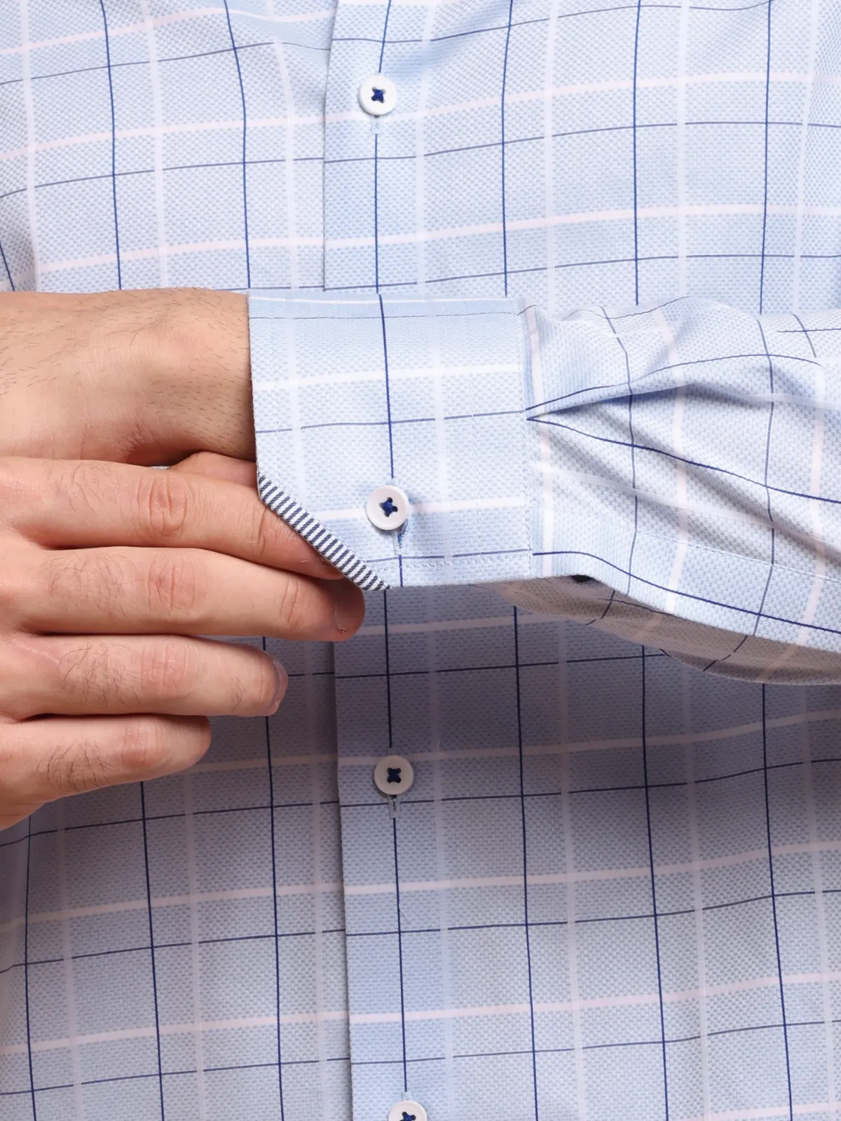 This elegant shirt is crafted with 100% pure cotton non-iron yarn dyed premium fabric, showcasing mist blue base with an accent of white and royal blue satin checks. The unique contrast inner collar band and cuff details sets this dress shirt apart from the rest.