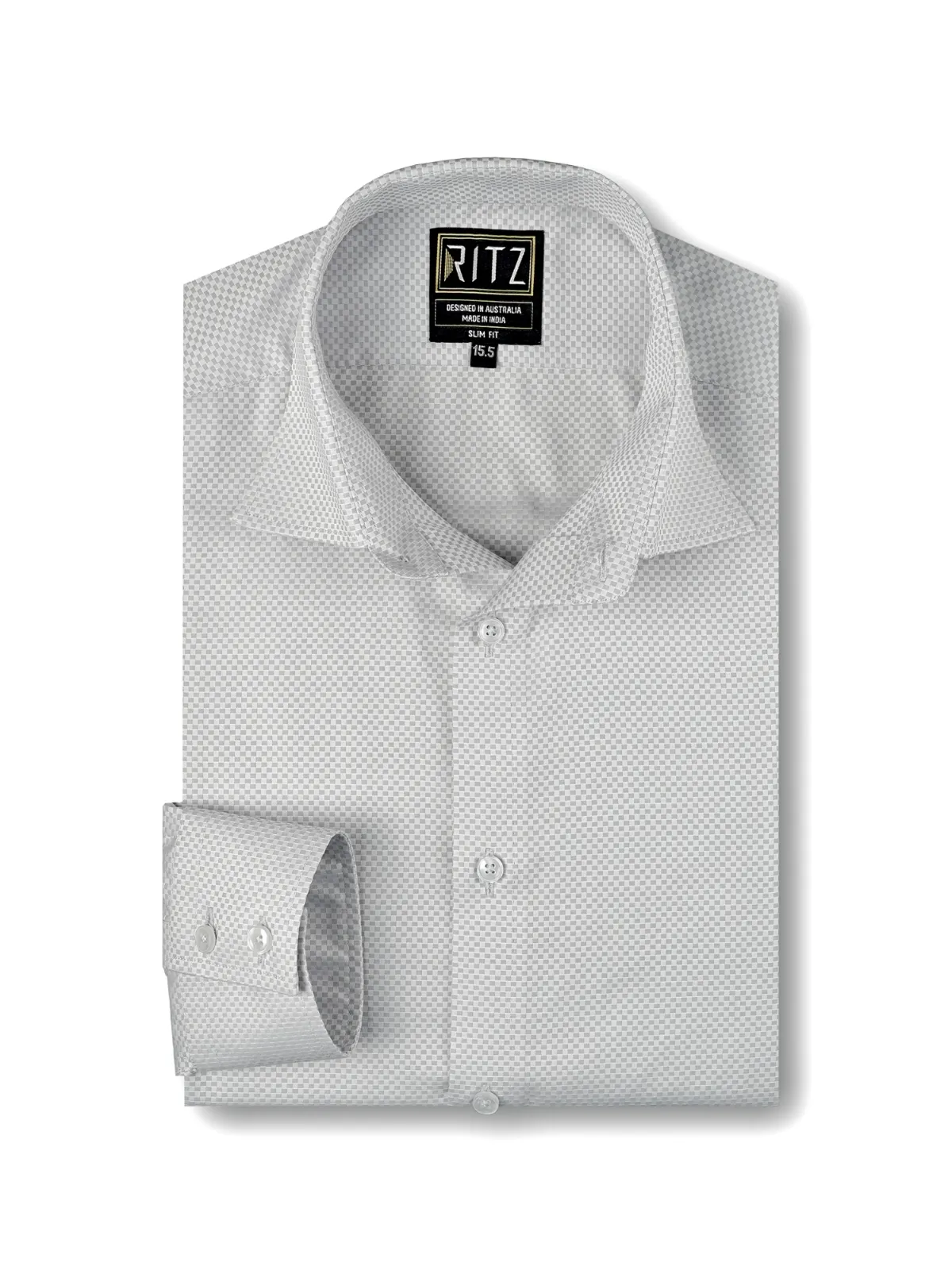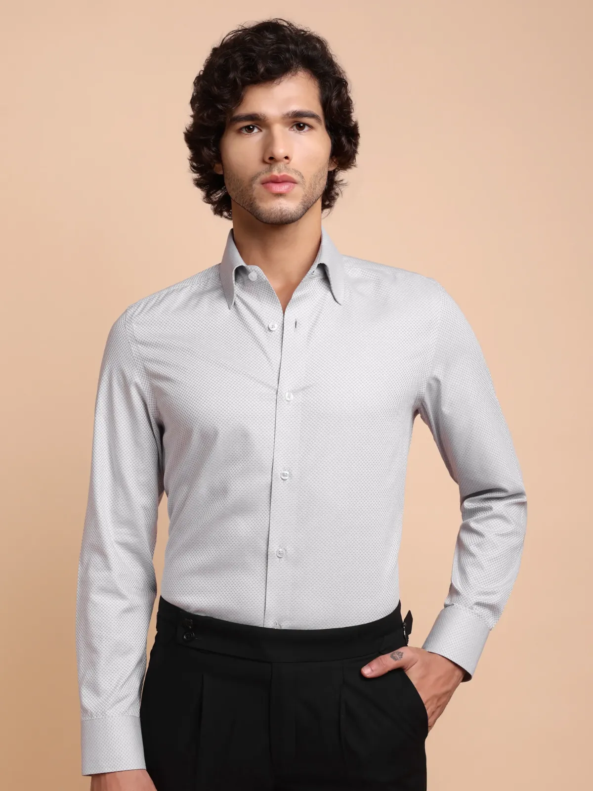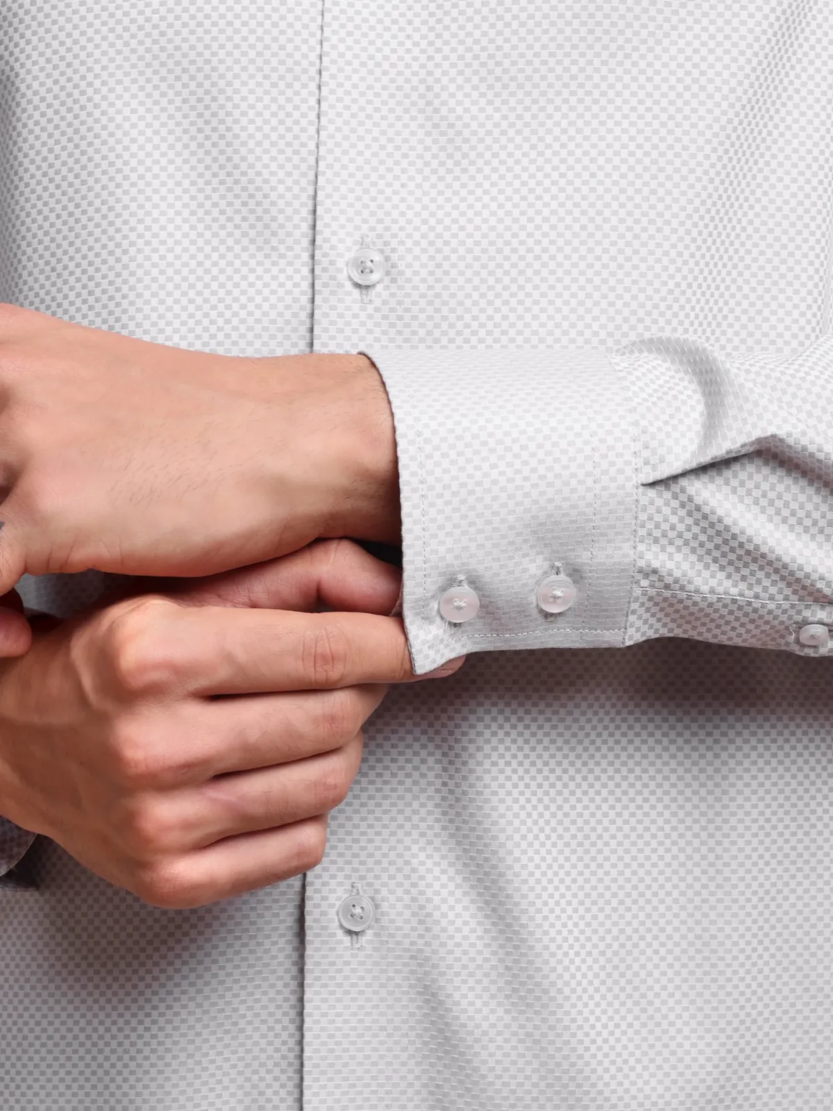 This shirt consists of gray base fabric with a popular dobby weave that showcases a subtle but unique checkerboard pattern. The weave is also referred as Dobby Check. The slightly wider collar points create a more contemporary look, while the combination of classic colours keeps the elegant statement intact.