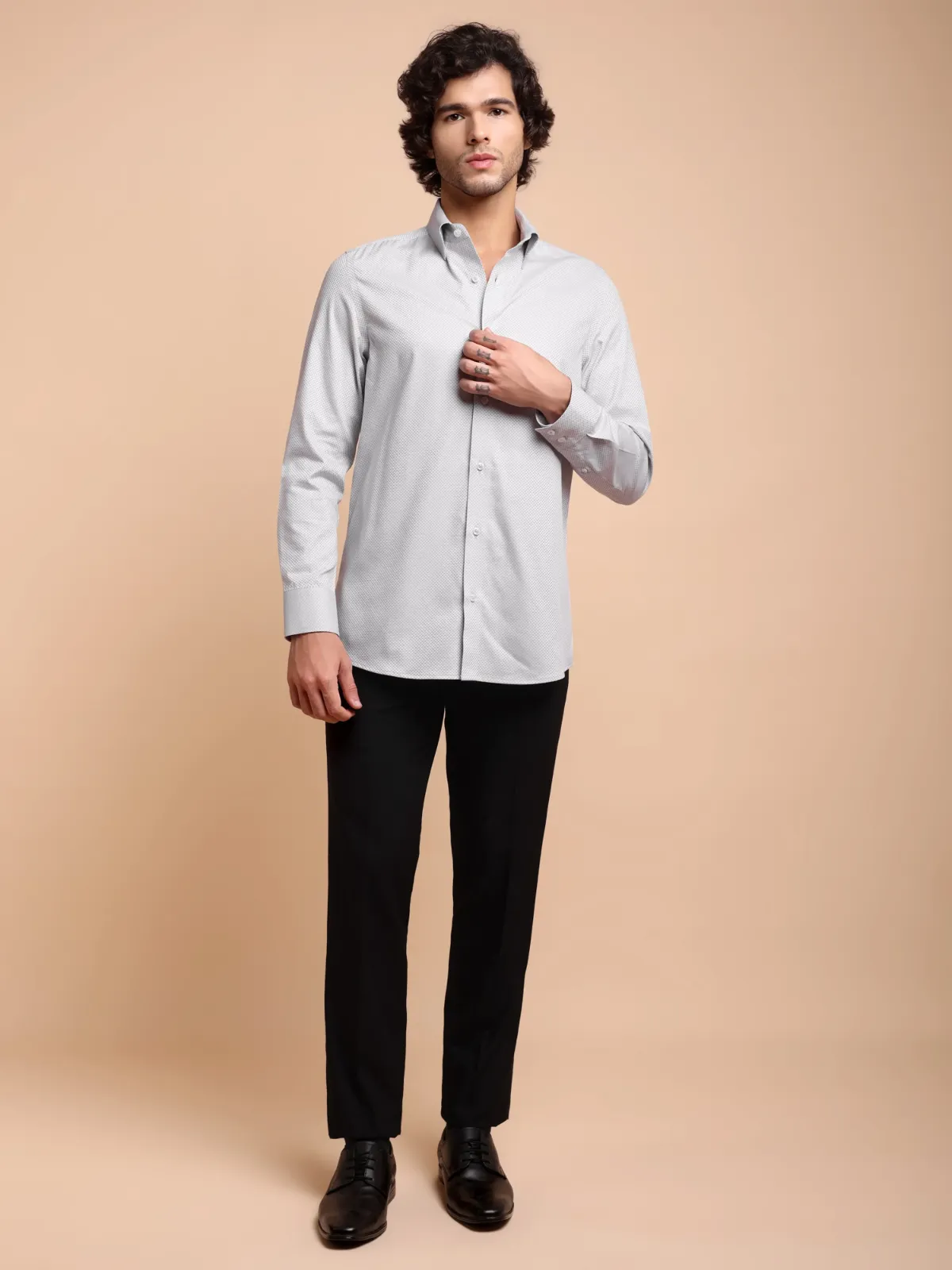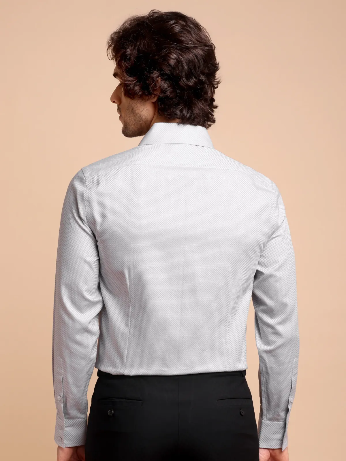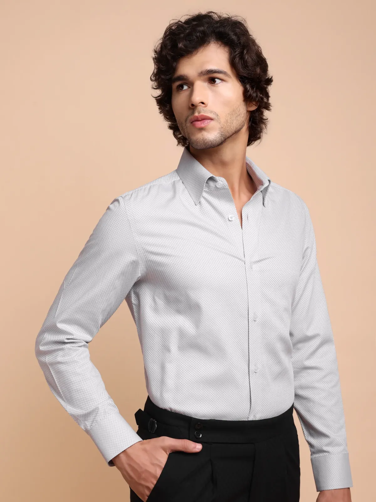 This shirt consists of gray base fabric with a popular dobby weave that showcases a subtle but unique checkerboard pattern. The weave is also referred as Dobby Check. The slightly wider collar points create a more contemporary look, while the combination of classic colours keeps the elegant statement intact.