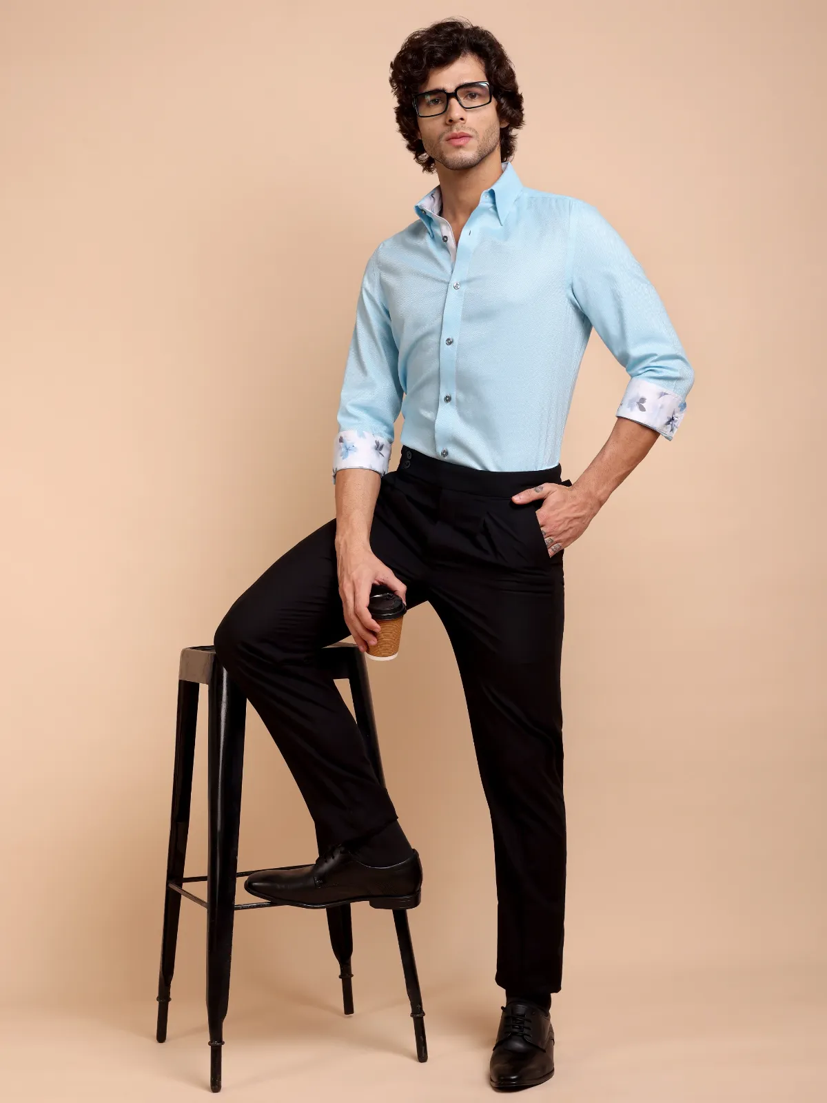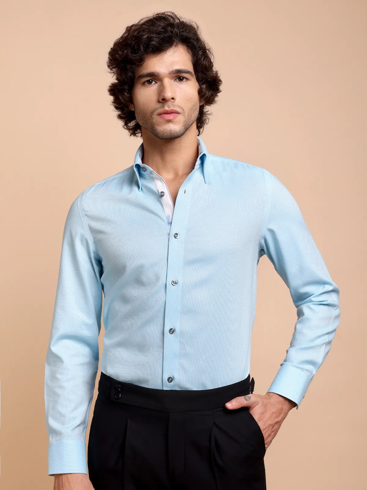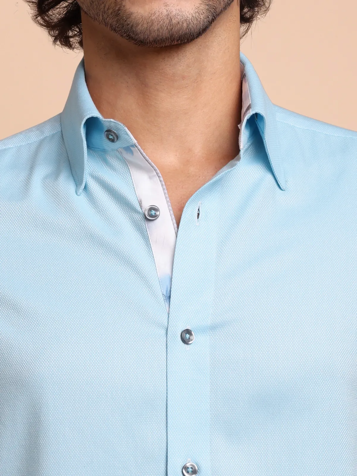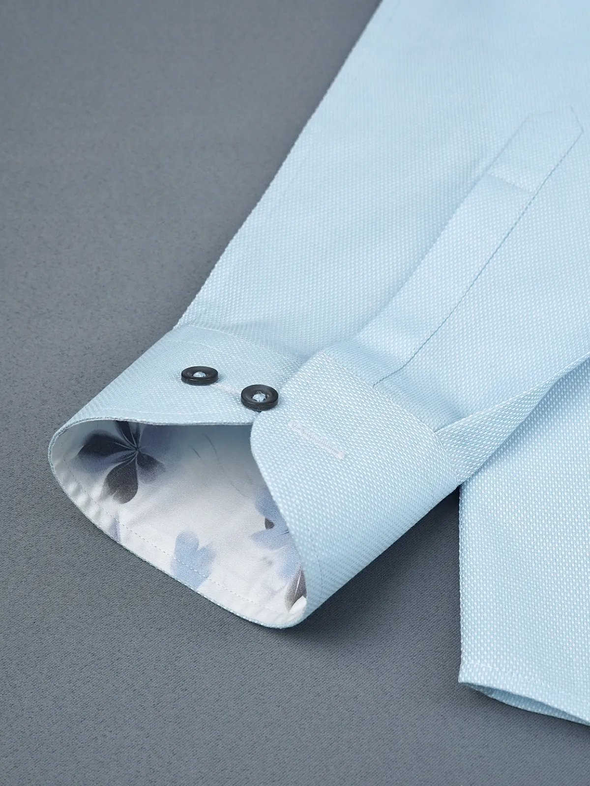 Immerse yourself in sophisticated style with this pure cotton Topaz shirt, showcasing subtle Dobby Weave. Uniquely crafted collar, cuffs and button placket using contrast floral print fabric, complementing the base fabric colour, redefines the conventional elegance.
