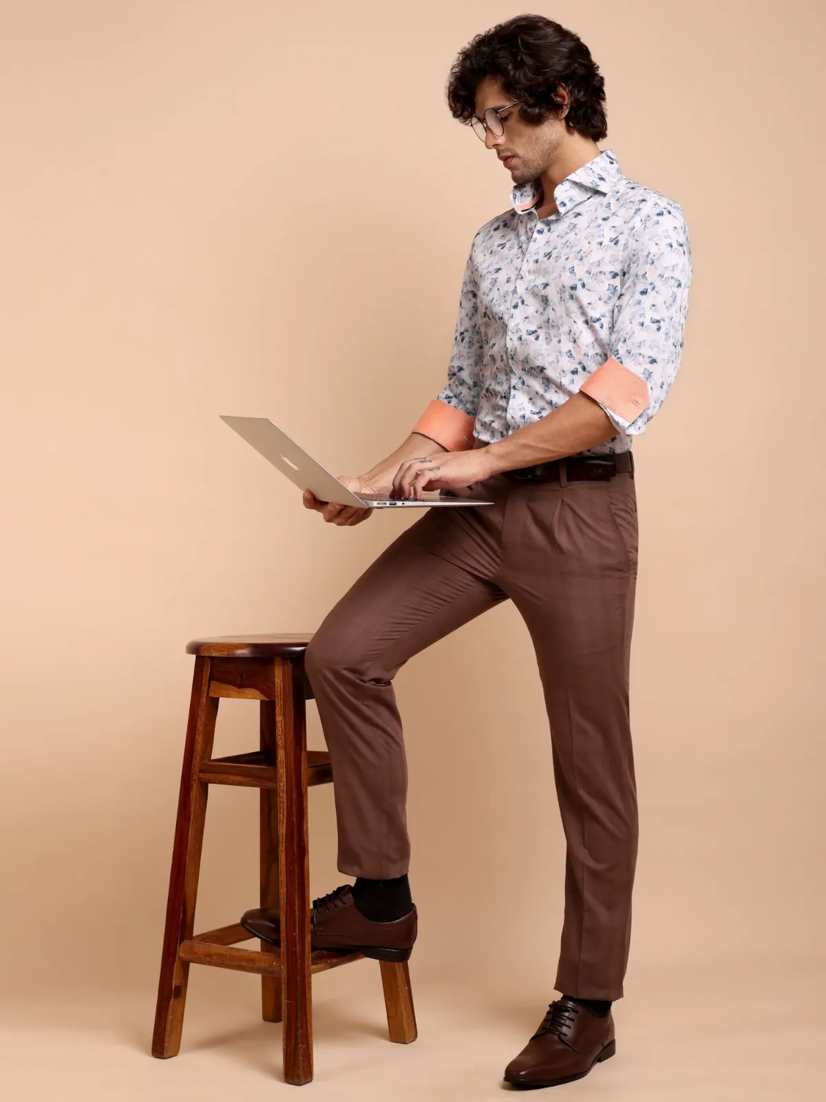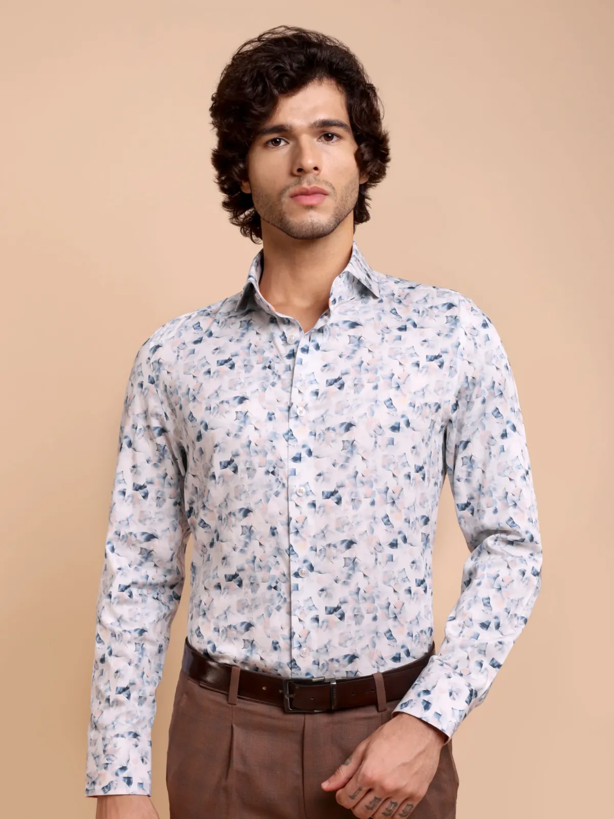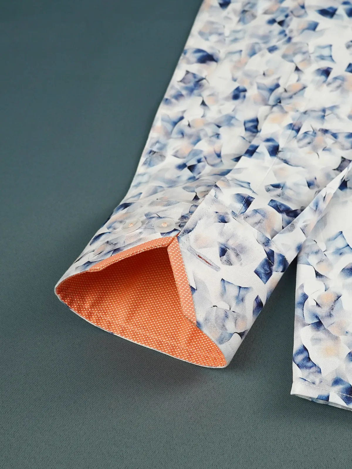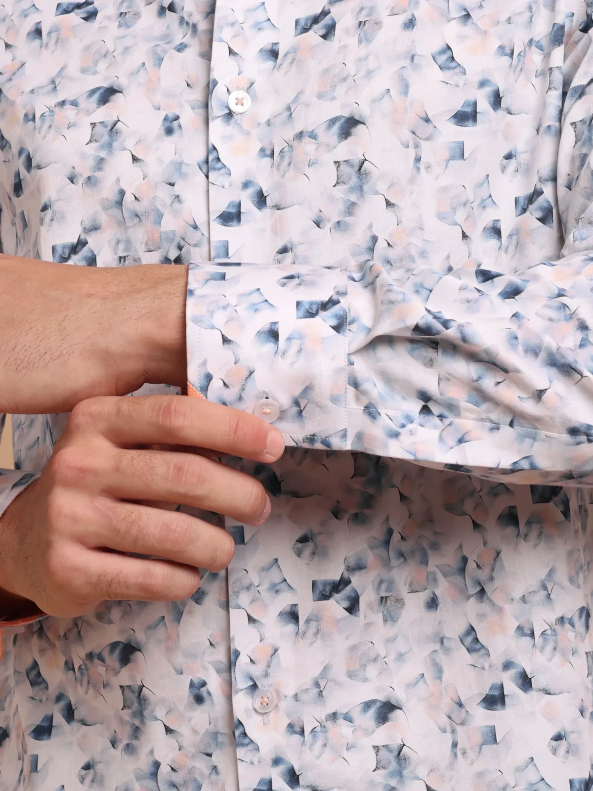 This unique abstract print shirt is designed with contrast details on the inner collar band, around cuffs and button placket, making it one of a kind. The premium cotton fabric is smooth and breathable ? making it suitable for any season. This artistically designed shirt is a distinct upgrade to your workwear or casual outings.