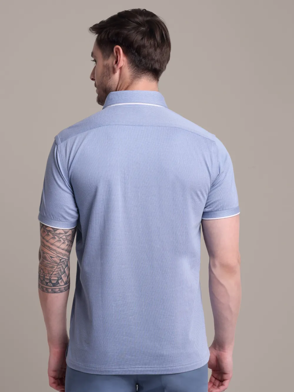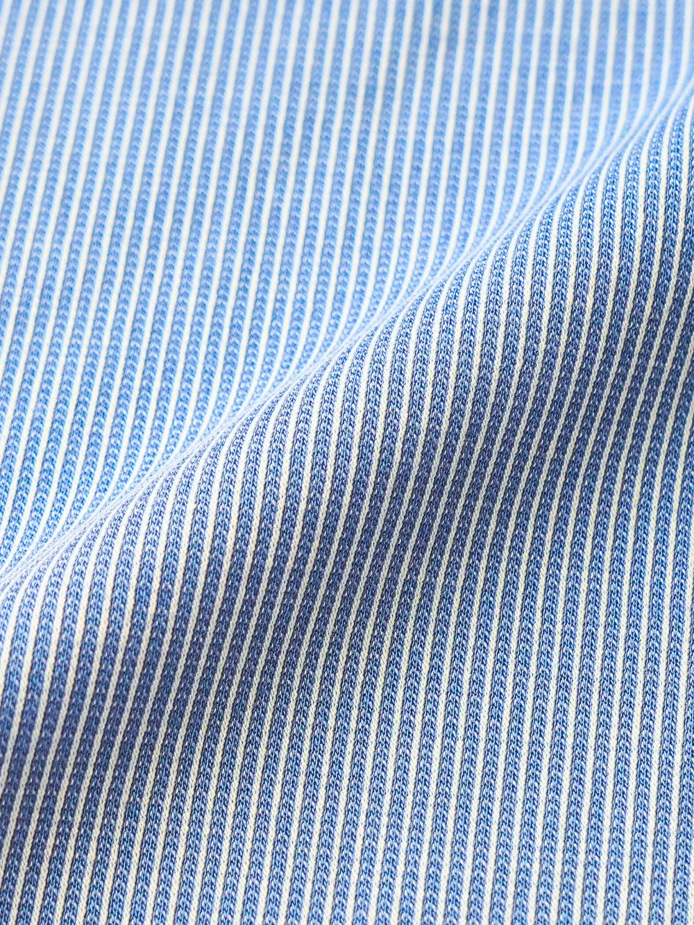 The elegant white stripes on washed blue base is beautifully offset by clean white accents on the inner placket and collar, lending contrast and refinement without being loud. Details like the sleek piped sleeves and precisely cut hemline complete the garment with understated polish.