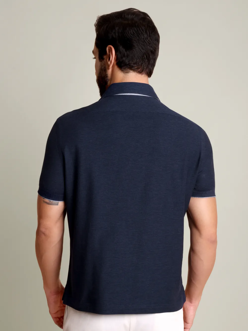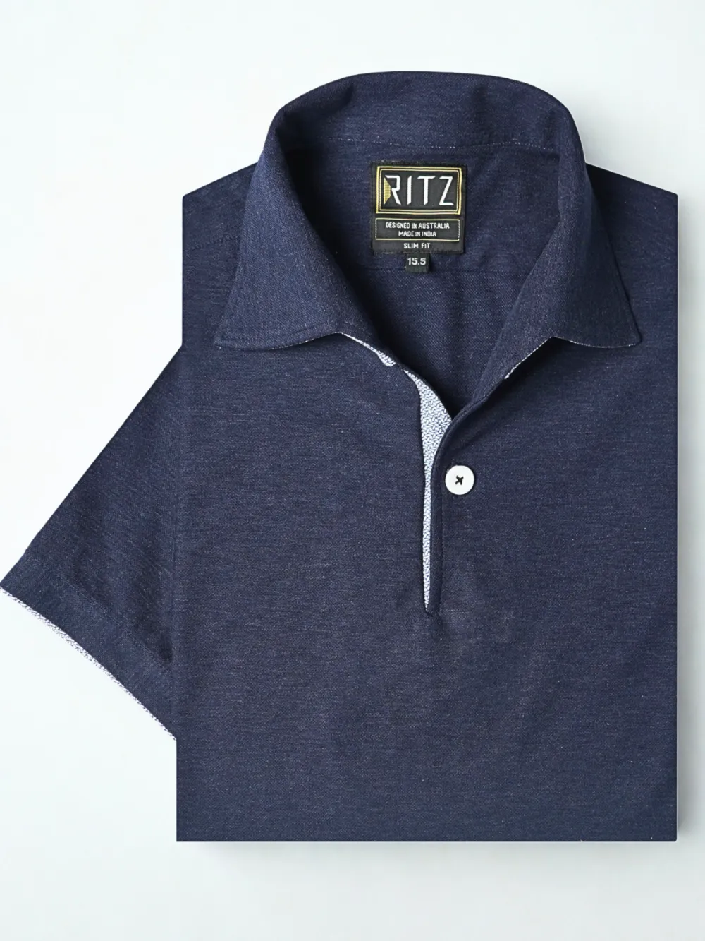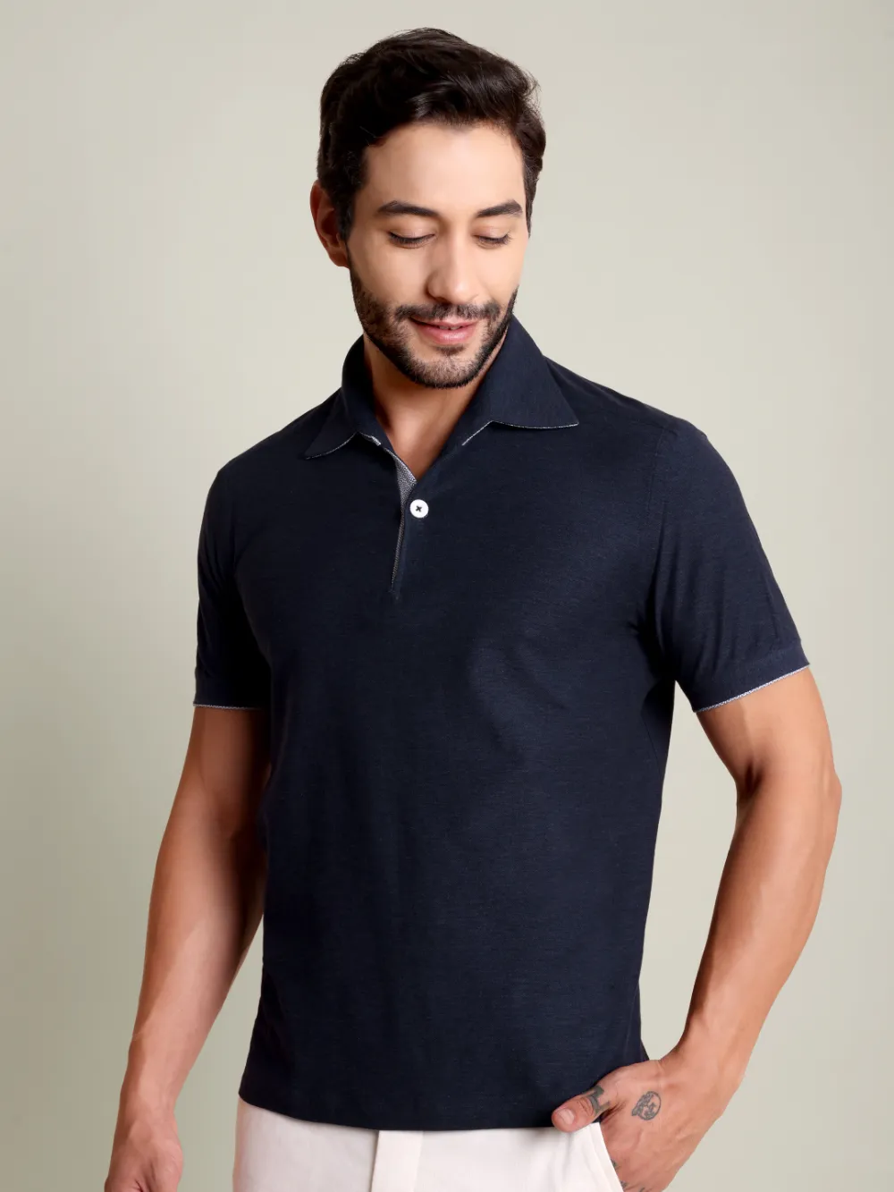 The deep Navy Blue base is complemented by subtle printed inner placket and collar detailing, adding depth and contrast without overpowering. Finished with finely piped sleeve edges and a tailored hemline, this polo is both minimal and memorable.