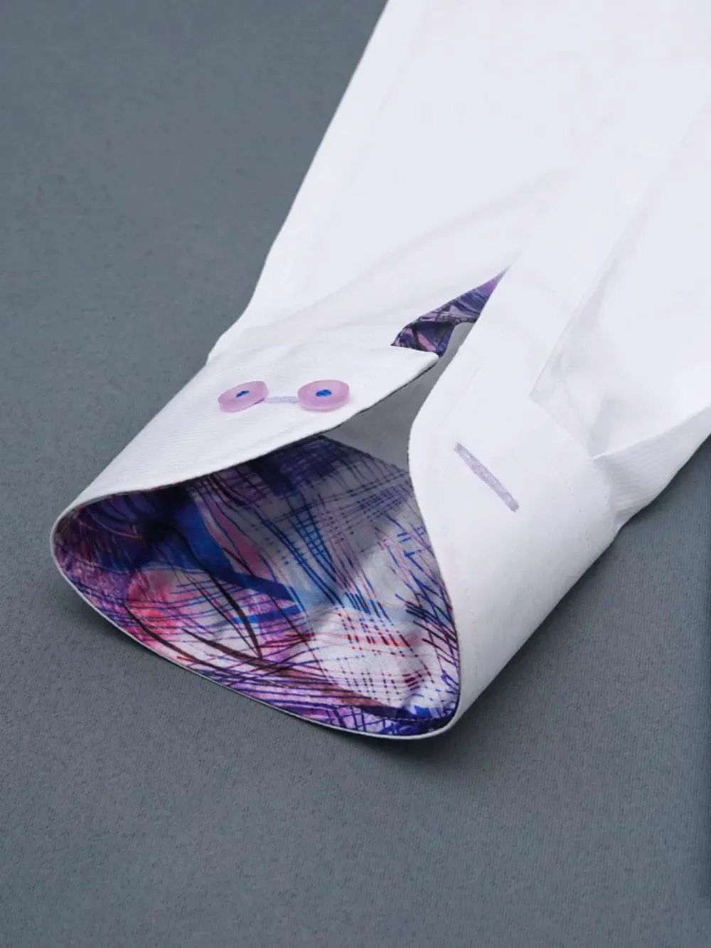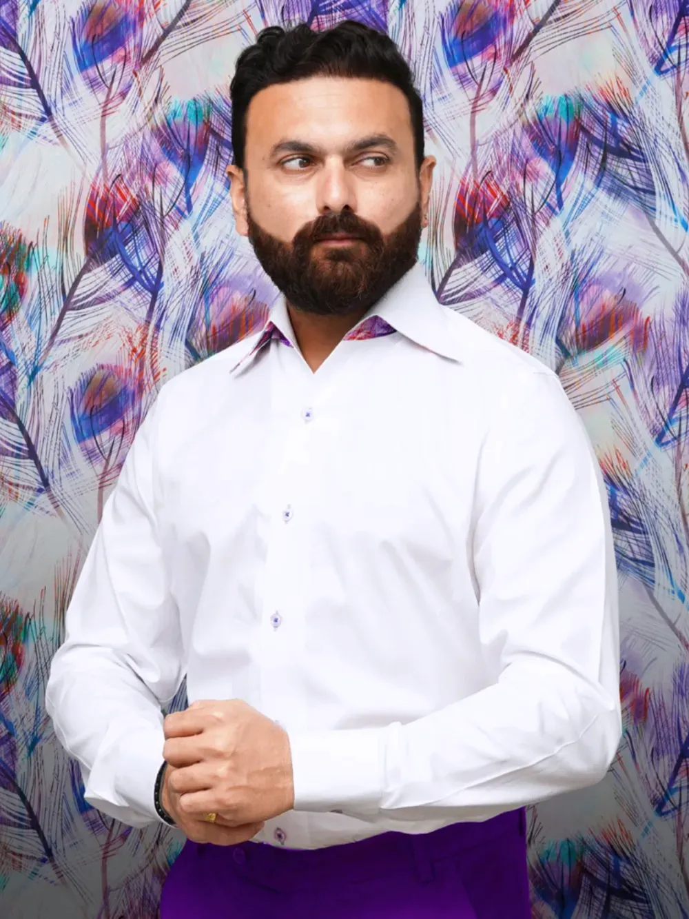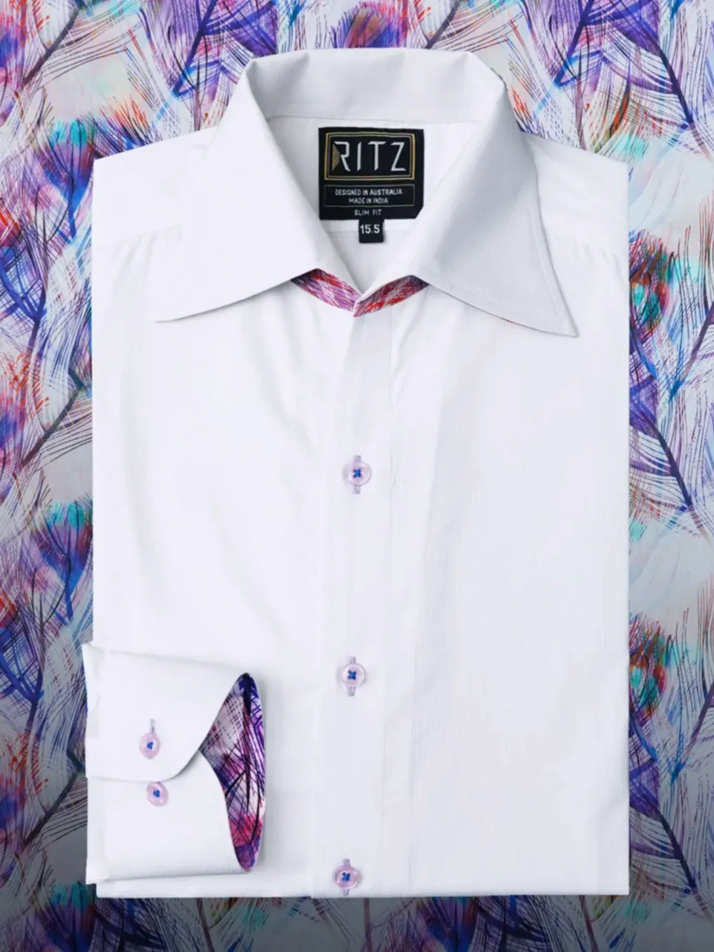Ritz The Label Signature Japanese Crepe Satin Blend One Piece – California Collar Shirt is designed with ultimate sophistication of white with a tinge of joyful colors that creates an unmatched style and a unique statement. The classic self pin strips white pure cotton fabric is known for its appeal for elegance whereas the satin fabric with colorful peacock feathers print provides, this unique piece, its unique style. The California Collar is created with one piece collar method so that no seamline is visible on the inside of the collar – running from placket to placket. The colors of button, buttonhole and the button thread is chosen carefully to complement the blended fabric colors.