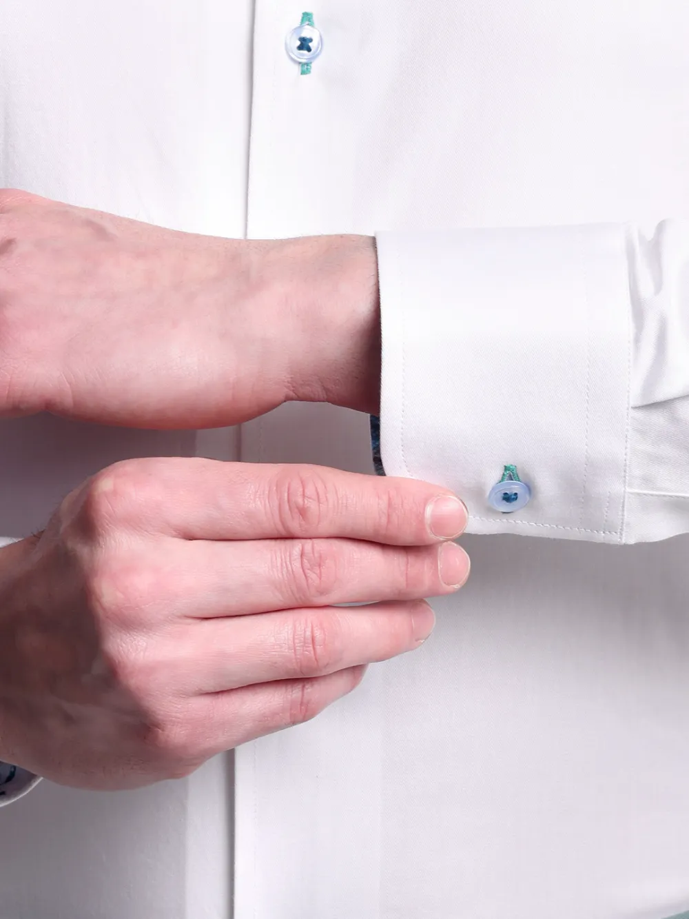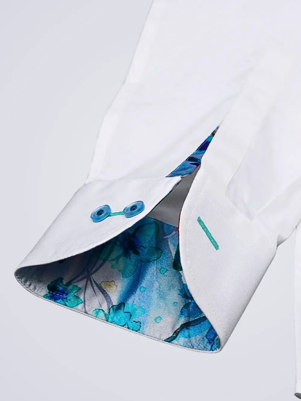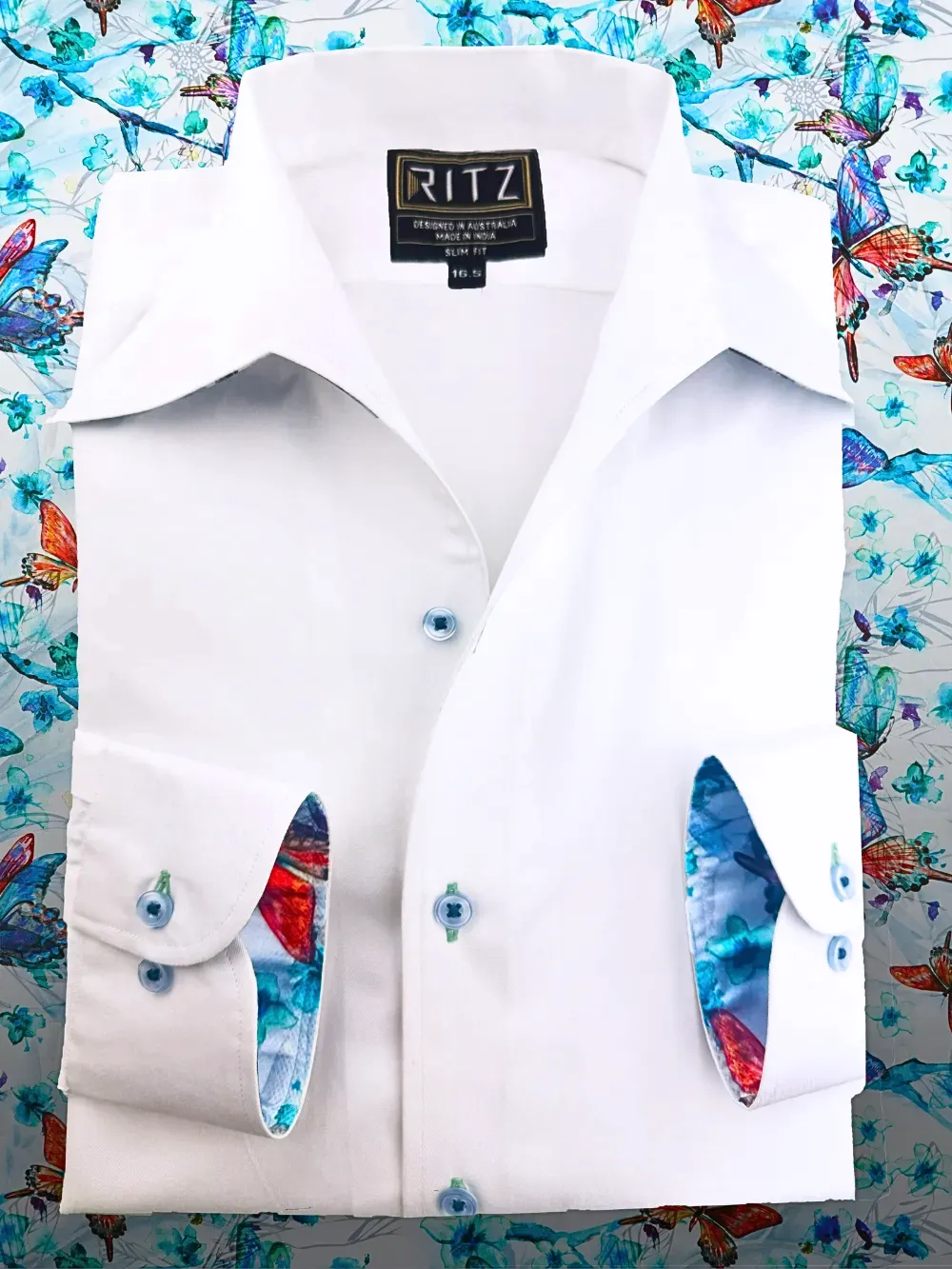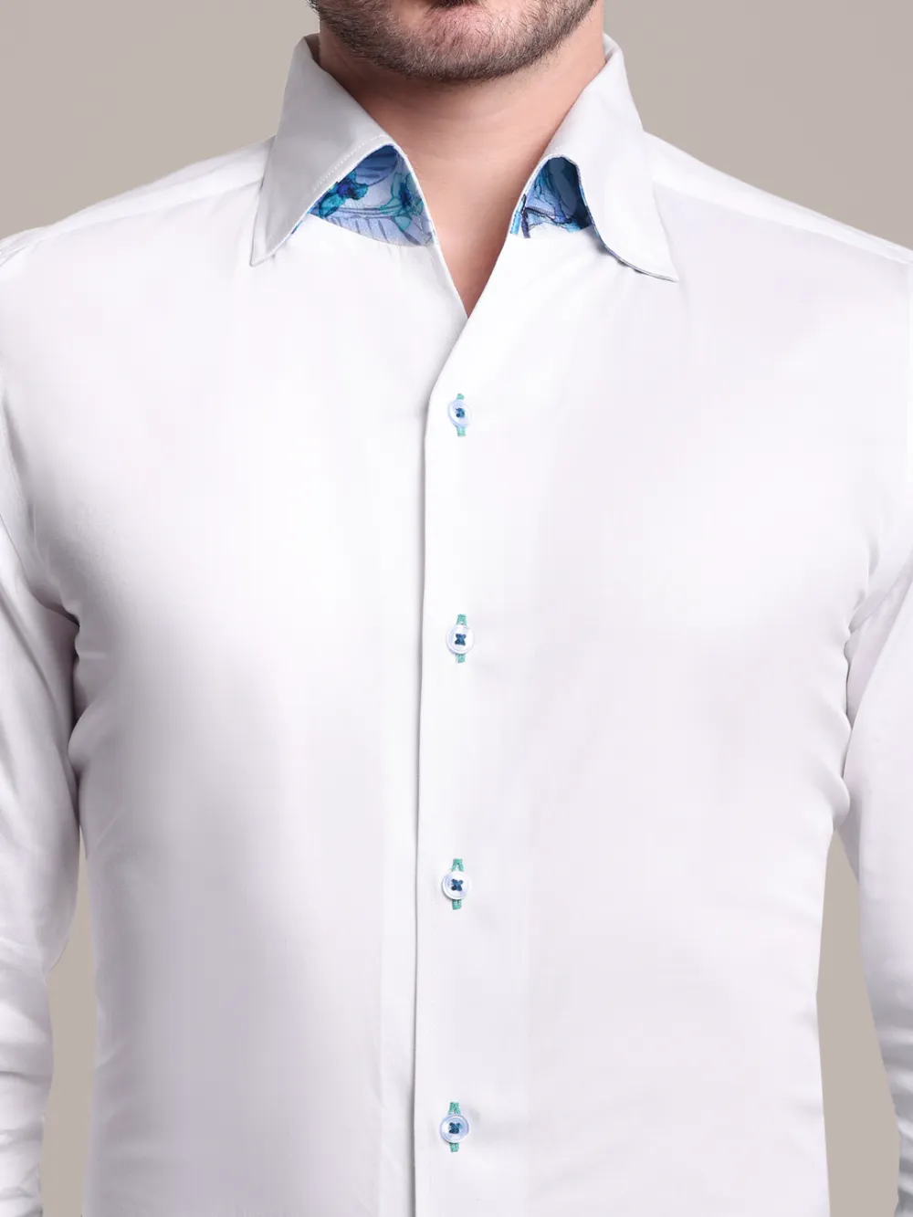 Our Signature Japanese Crepe Satin Blend One Piece – California Collar Shirt is designed with ultimate sophistication of white with a tinge of joyful colors that creates an unmatched style and a unique statement. The classic twill weave white pure cotton fabric is known for its appeal for elegance whereas the satin fabric with colorful butterfly print provides, this unique piece, its unique style. The California Collar is created with one piece collar method so that no seamline is visible on the inside of the collar – running from placket to placket. The colors of button, buttonhole and the button thread is chosen carefully to complement the blended fabric colors.