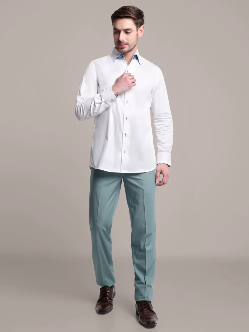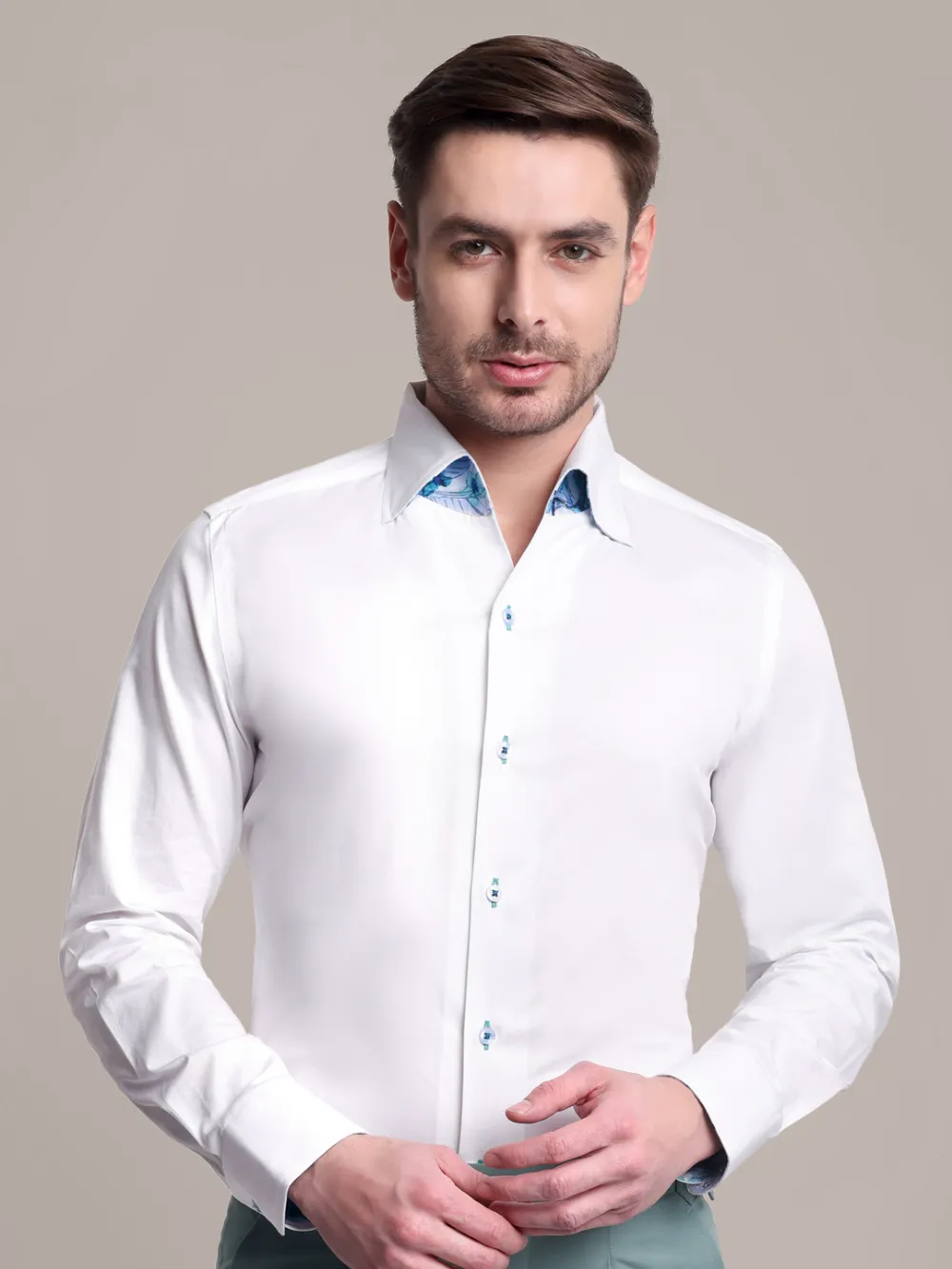 Indulge in ultimate luxury with this designer men’s white shirt, crafted from a refined twill weave cotton enhanced with Japanese crepe satin. This unique fusion of fabrics brings together a touch of sophistication and an elegant drape. Subtle yet distinctive color accents elevate its timeless appeal, making it a statement piece for any discerning wardrobe.