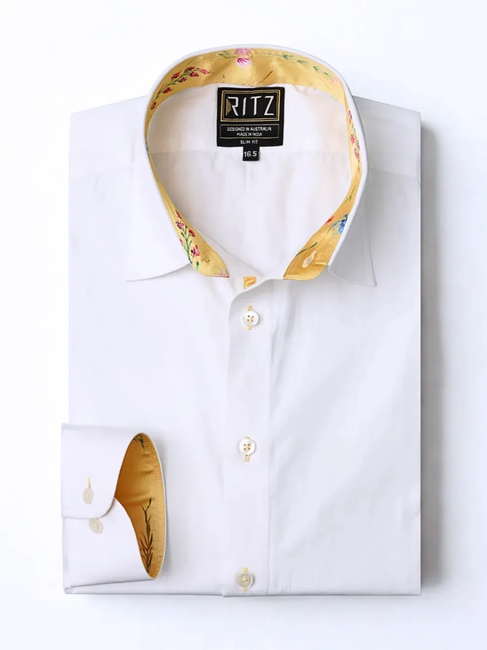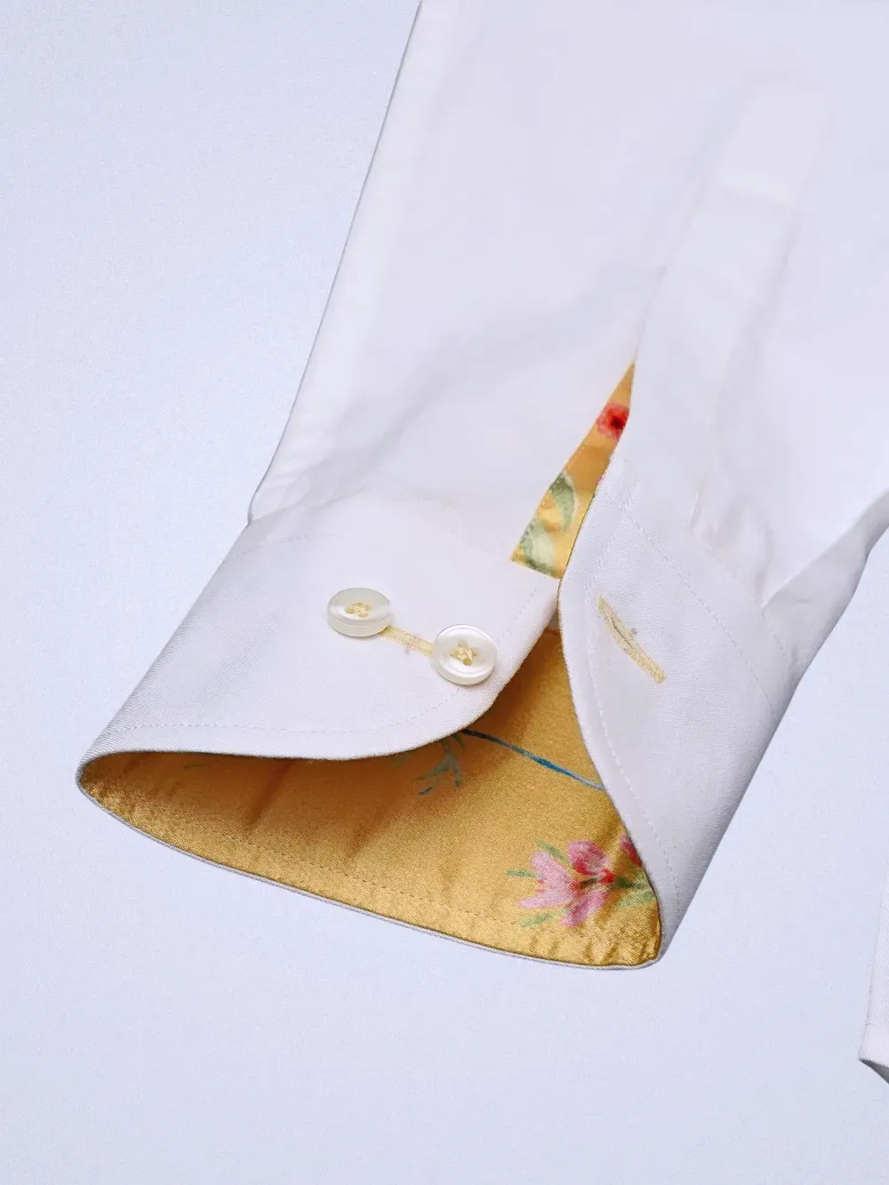 Our Signature Japanese Crepe Satin Blend Collar Shirt is designed with ultimate sophistication of white with a tinge of joyful colors that creates an unmatched style and a unique statement. The classic twill weave white pure cotton fabric is known for its appeal for elegance whereas the satin fabric with colorful floral print provides, this unique piece, its unique style. The colors of button, buttonhole and the button thread is chosen carefully to complement the blended fabric colors.