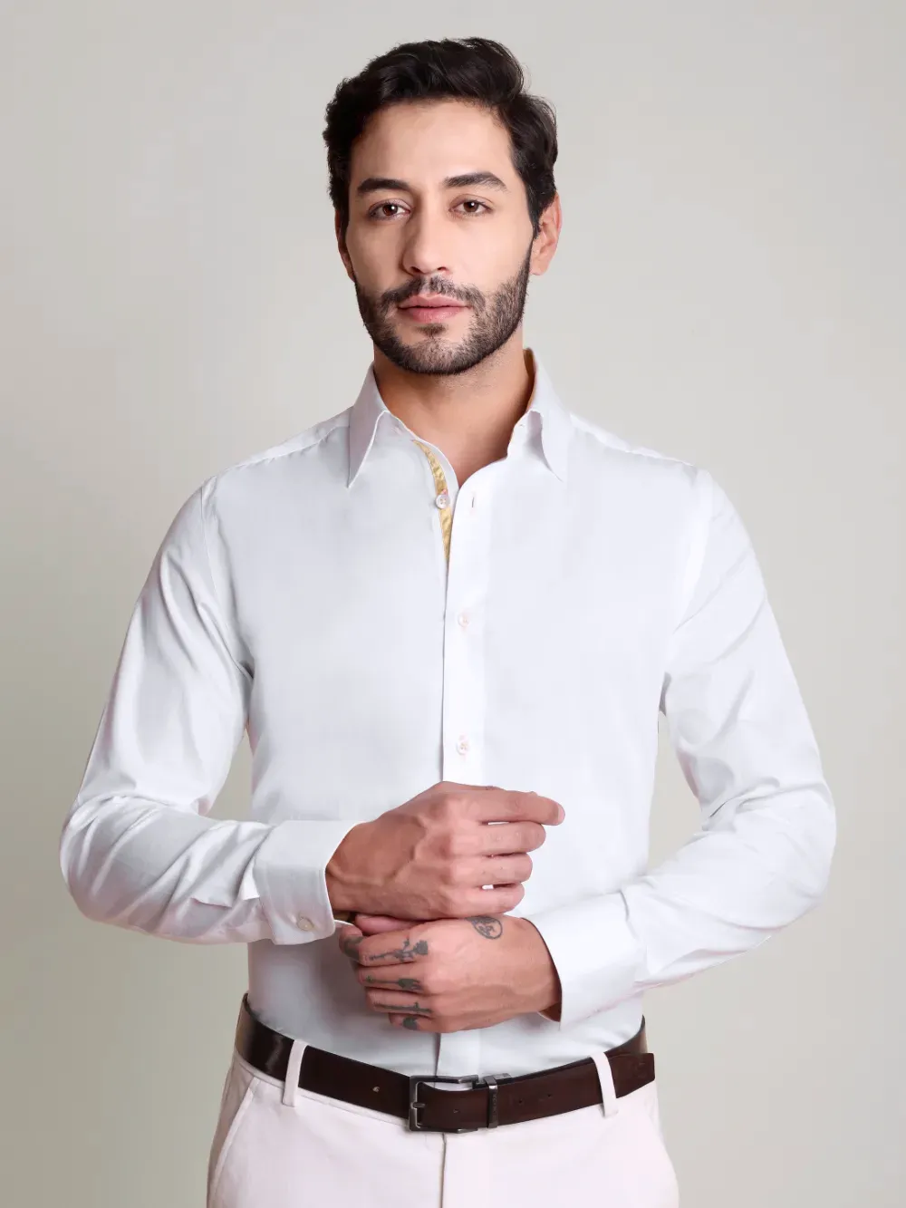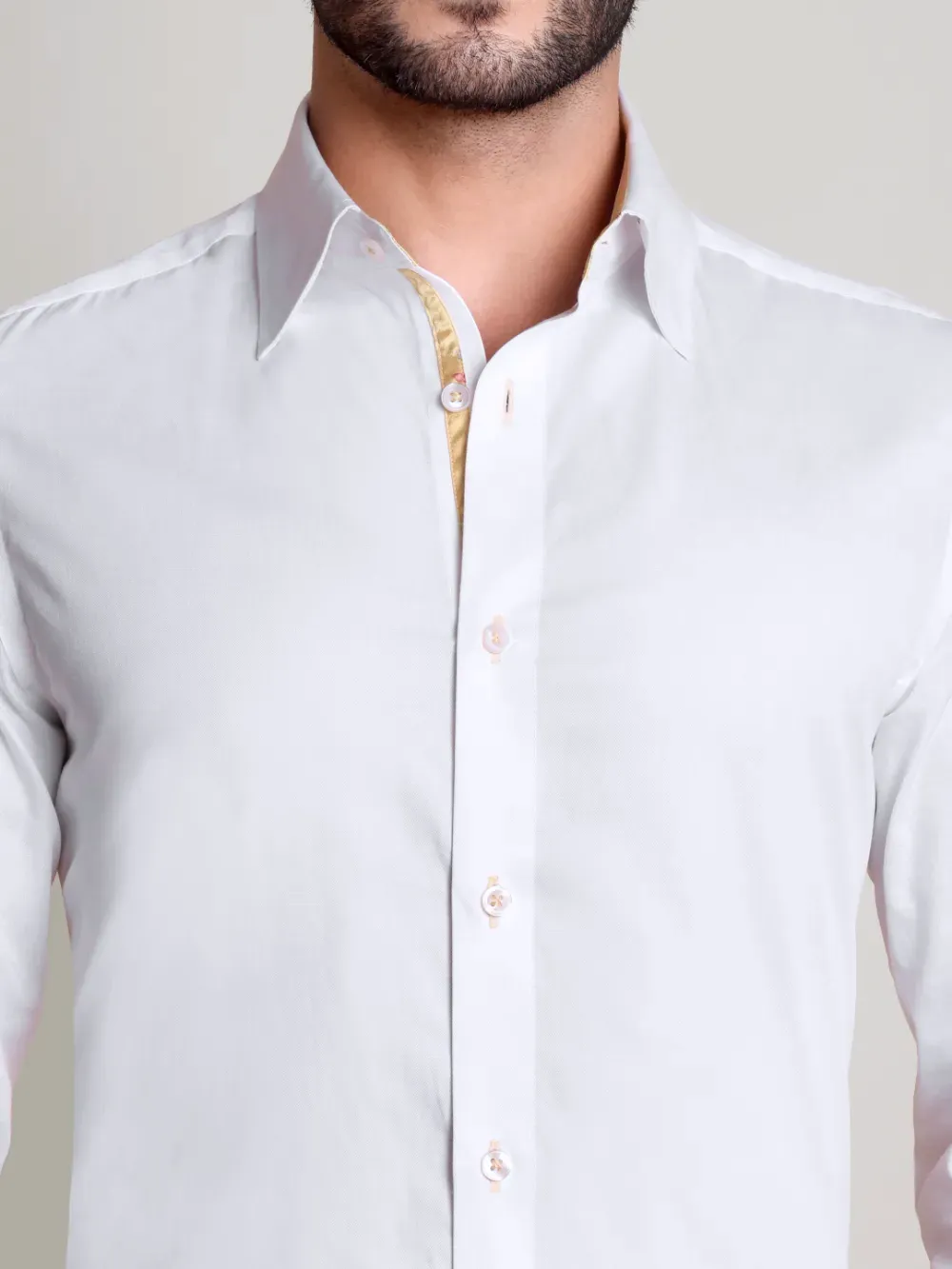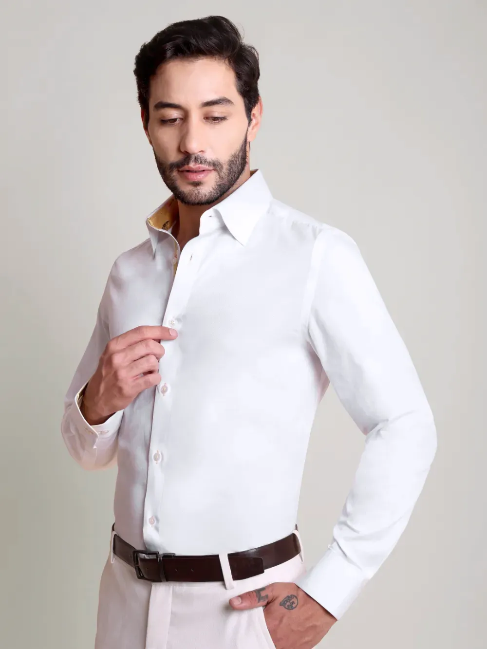 Indulge in ultimate luxury with this designer men’s white shirt, crafted from a refined twill weave cotton enhanced with Japanese crepe satin. This unique fusion of fabrics brings together a touch of sophistication and an elegant drape. Subtle yet distinctive color accents elevate its timeless appeal, making it a statement piece for any discerning wardrobe.