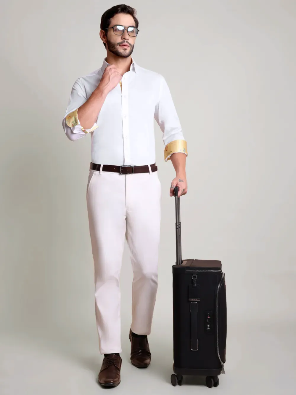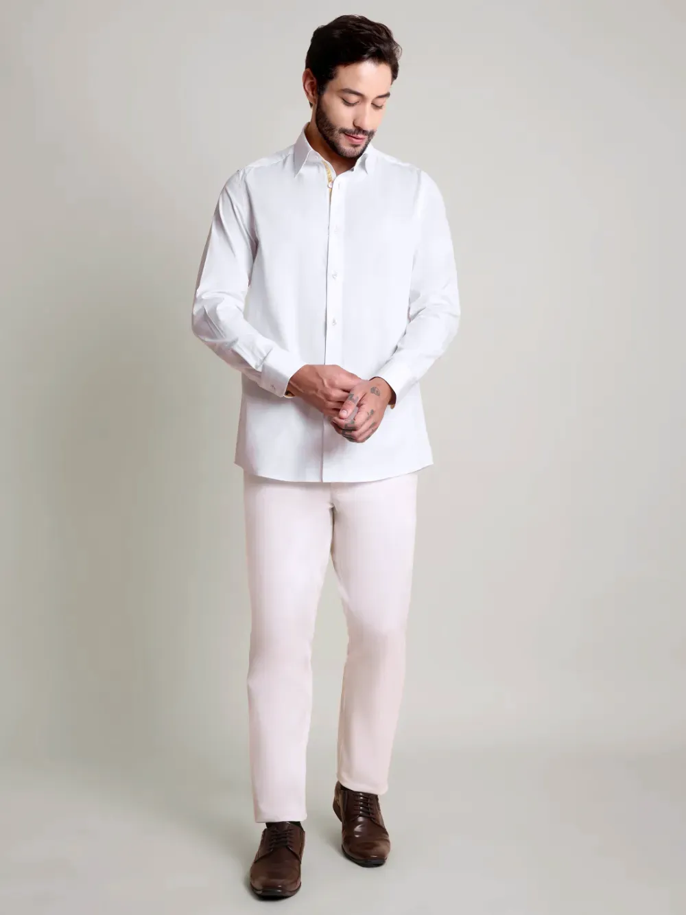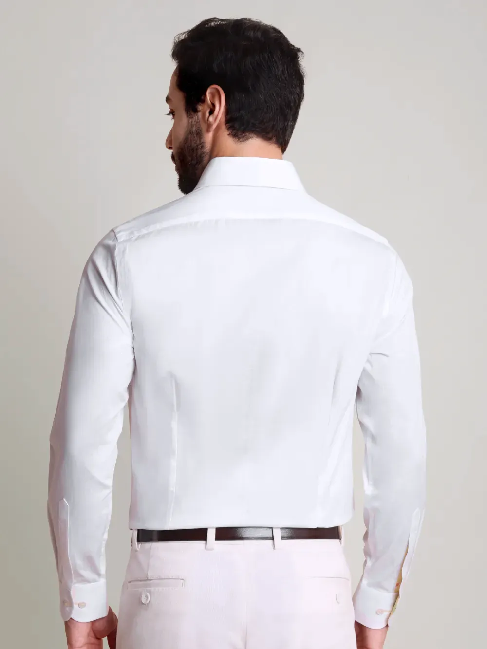 Indulge in ultimate luxury with this designer men’s white shirt, crafted from a refined twill weave cotton enhanced with Japanese crepe satin. This unique fusion of fabrics brings together a touch of sophistication and an elegant drape. Subtle yet distinctive color accents elevate its timeless appeal, making it a statement piece for any discerning wardrobe.