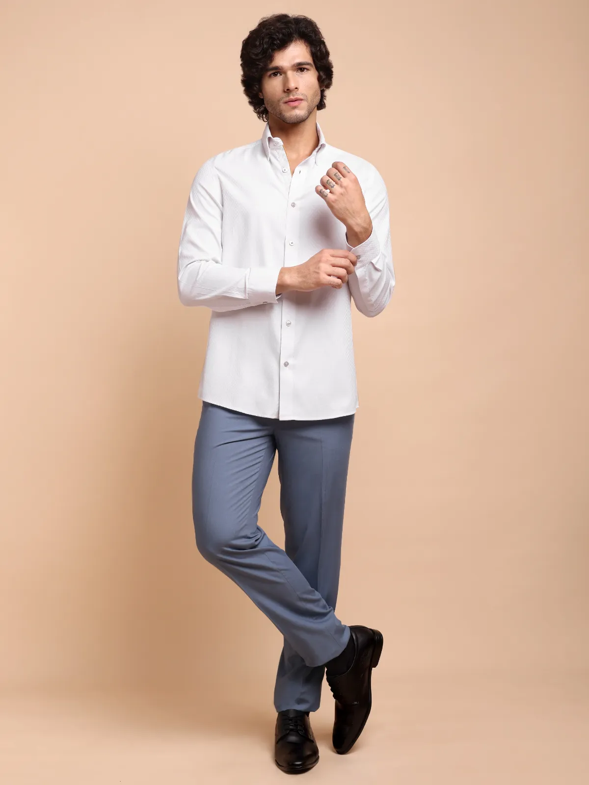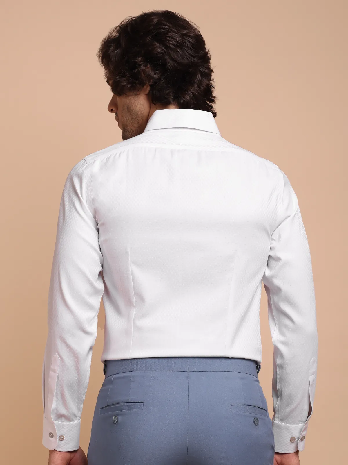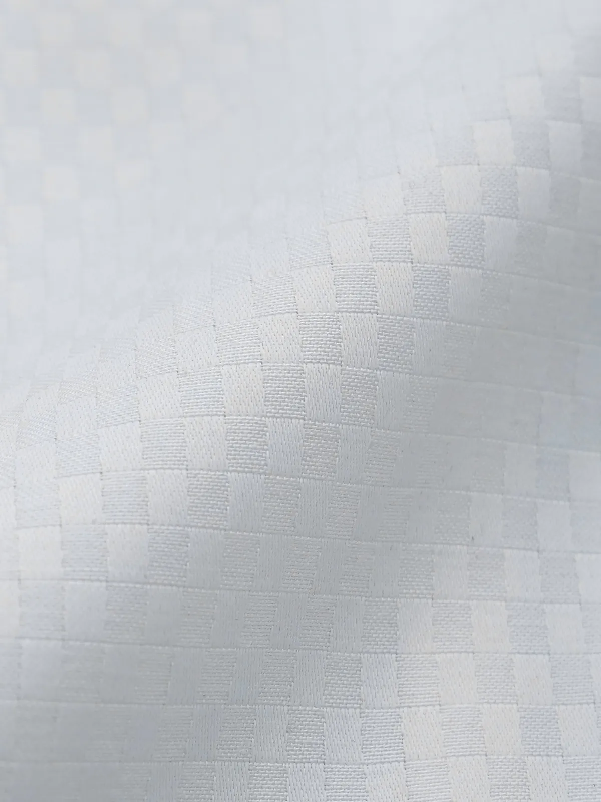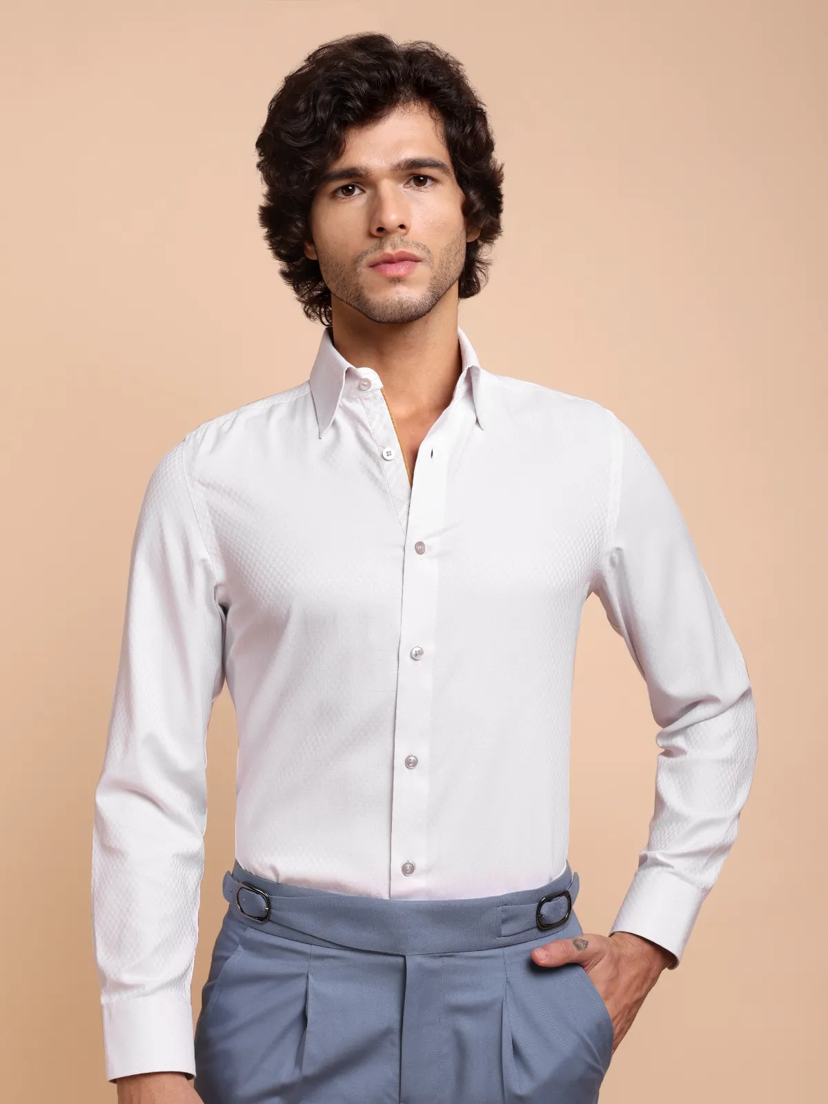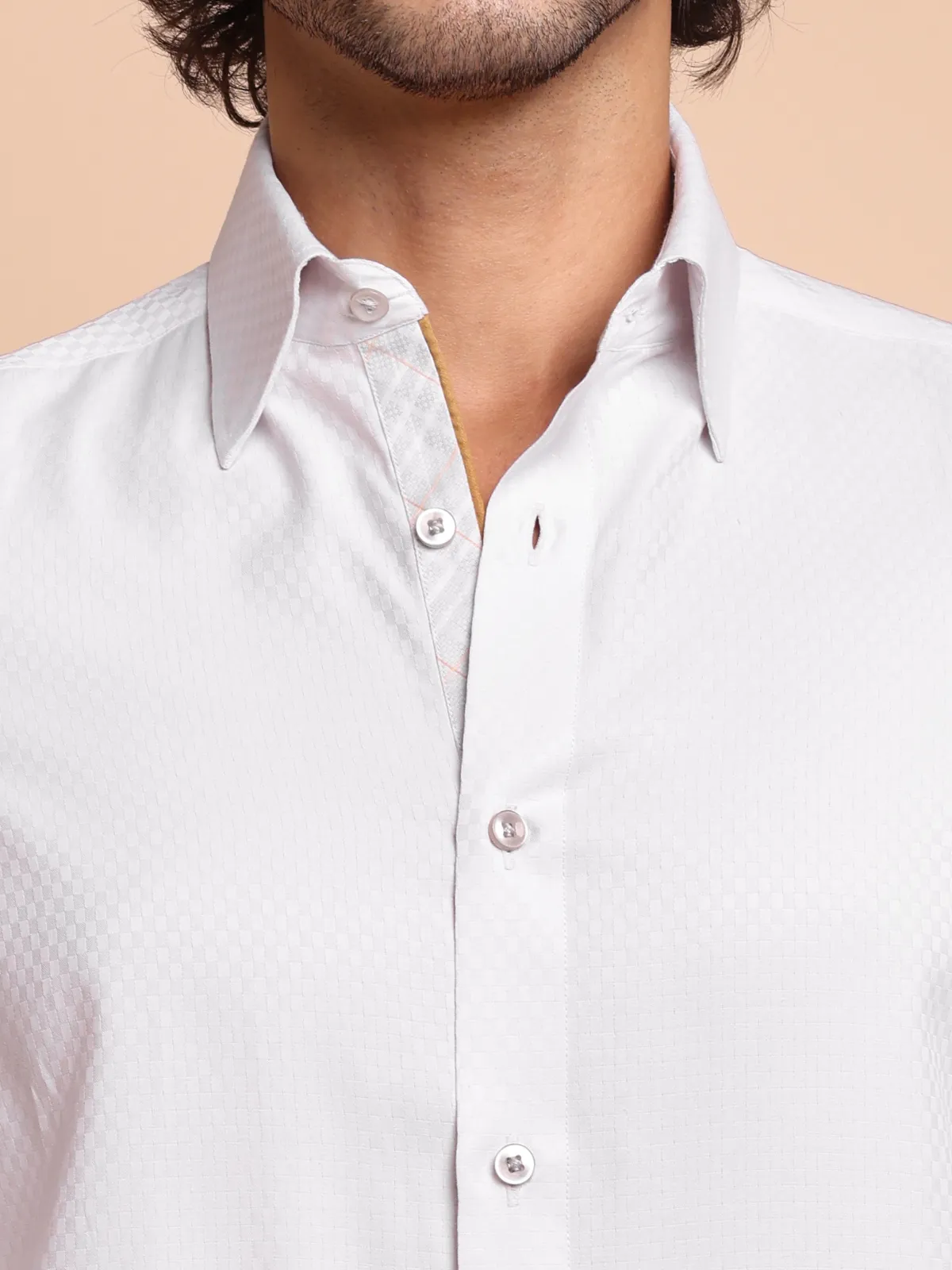 This refined white dress shirt from Ritz The Label is a modern classic, tailored for the discerning gentleman. Woven from a premium blend of fine cotton and eco-friendly fibres, the fabric showcases a subtle dobby texture that adds depth without overwhelming the design. The standout feature lies in its detailing: a contrast checked fabric lines the inner collar band, button placket, and inside cuffs, tastefully accented by a rich gold piping. Finished with lustrous buttons and precision tailoring, this slim-fit shirt balances quiet luxury with expressive personality.